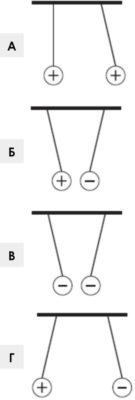 №5. Одинаковые шарики, подвешенные на нитях, заряженные так, как это показано на рисунках. В каком из случаев правильно изображено положение этих шариков, обусловлено их взаимодействием? (1-е фото)