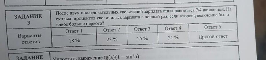 У Вас оба повышения расчитываются исходя из размера начальной зарплаты. А правильно считать второе повышение в процентах от повышенной в первый раз зарплаты. 1 × 1,25 × 1,5 = 15/8, а надо 7/4. Правильный ответ N 5 - там не целое число процентов.