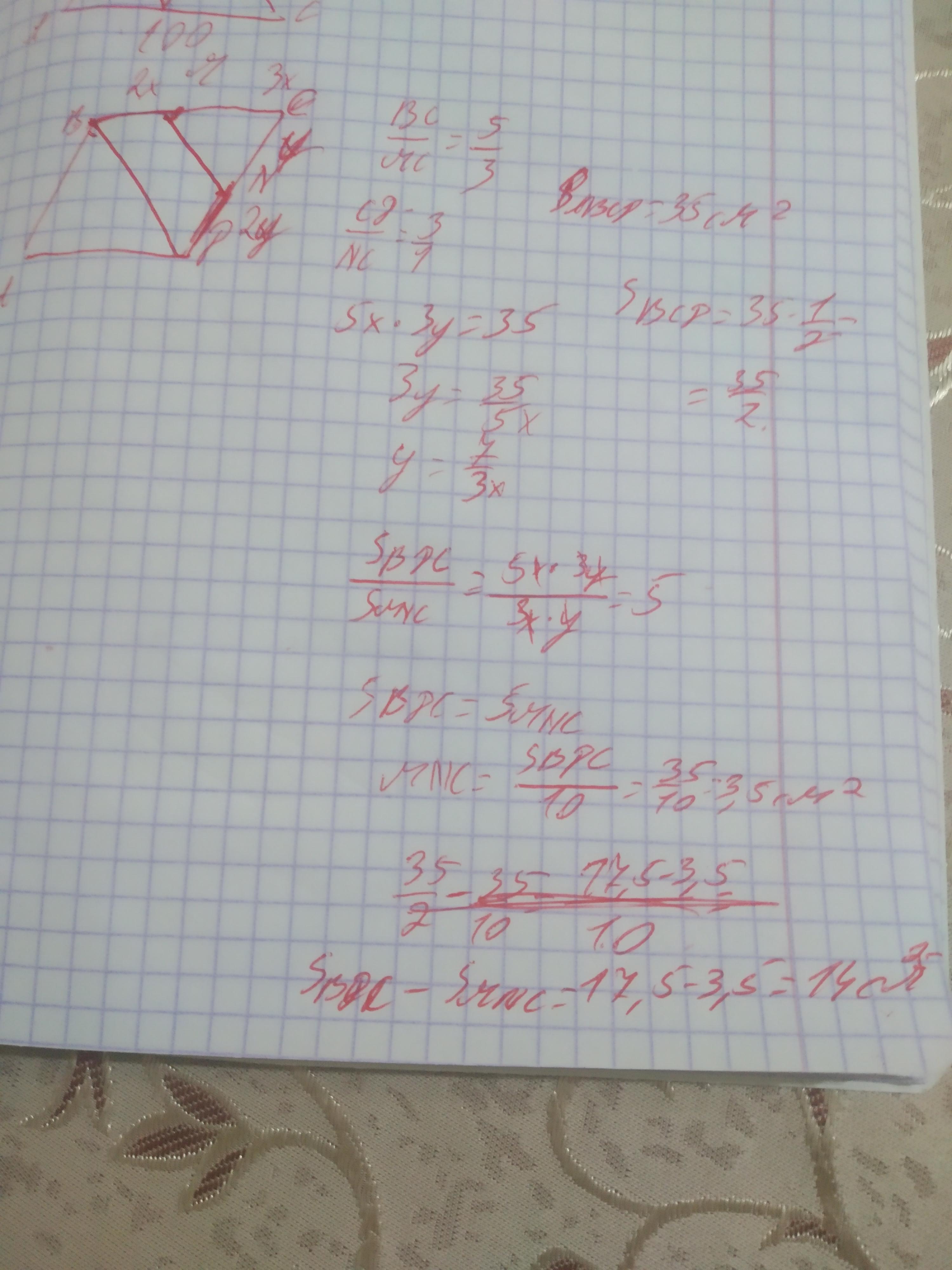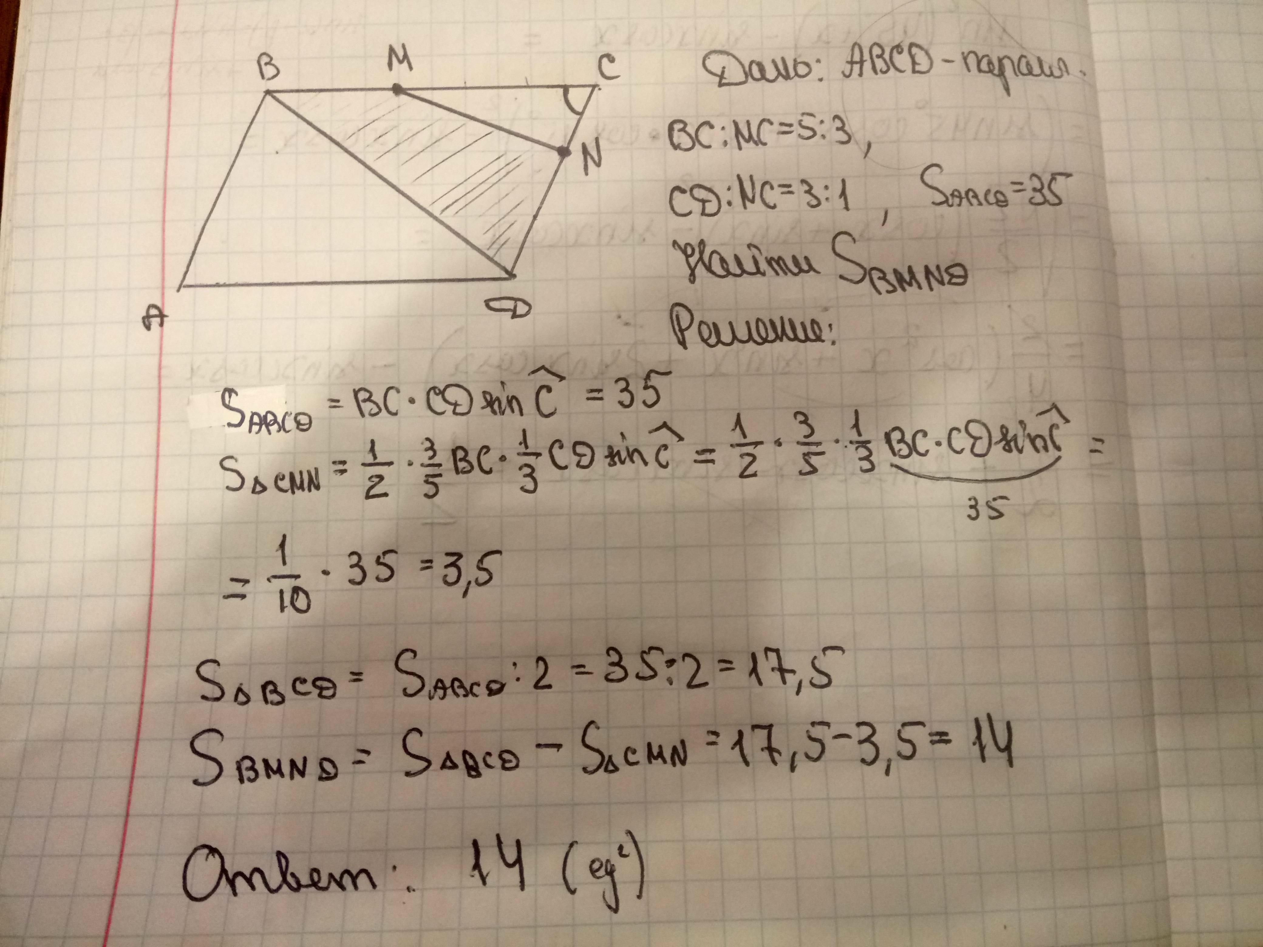 Дан параллелограмм АВСD. На сторонах ВС и СD соответственно взяты точки М и N так, что ВС : МС - 5: 3 и CD: NC - 3:1. Найдите площадь четырехугольника ВМND, если площадь параллелограмма АВСD равна 35. A) 16 B) 12 C) 14 D) 15