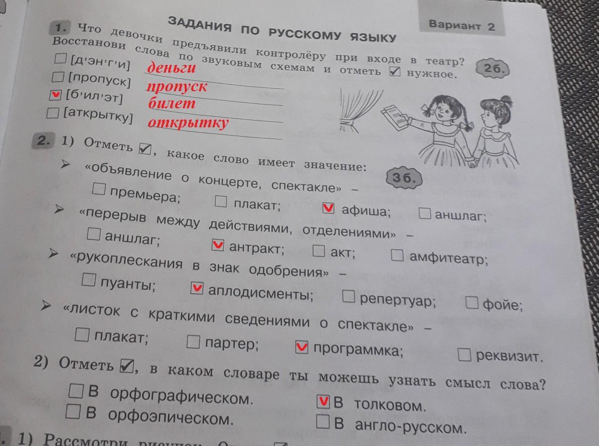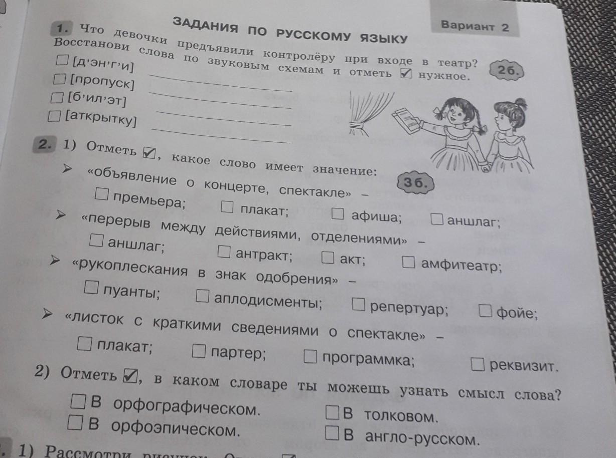 1 задание: Что девочки придъявили контролёру при входе в театр? Восстанови слова по звукомым схемам и отметь нужное
