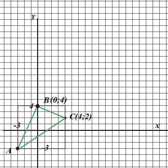 найдите площадь треугольника вершинами которого являются точки с координатами A(-3:-3); B(0;4); C(4;2).
