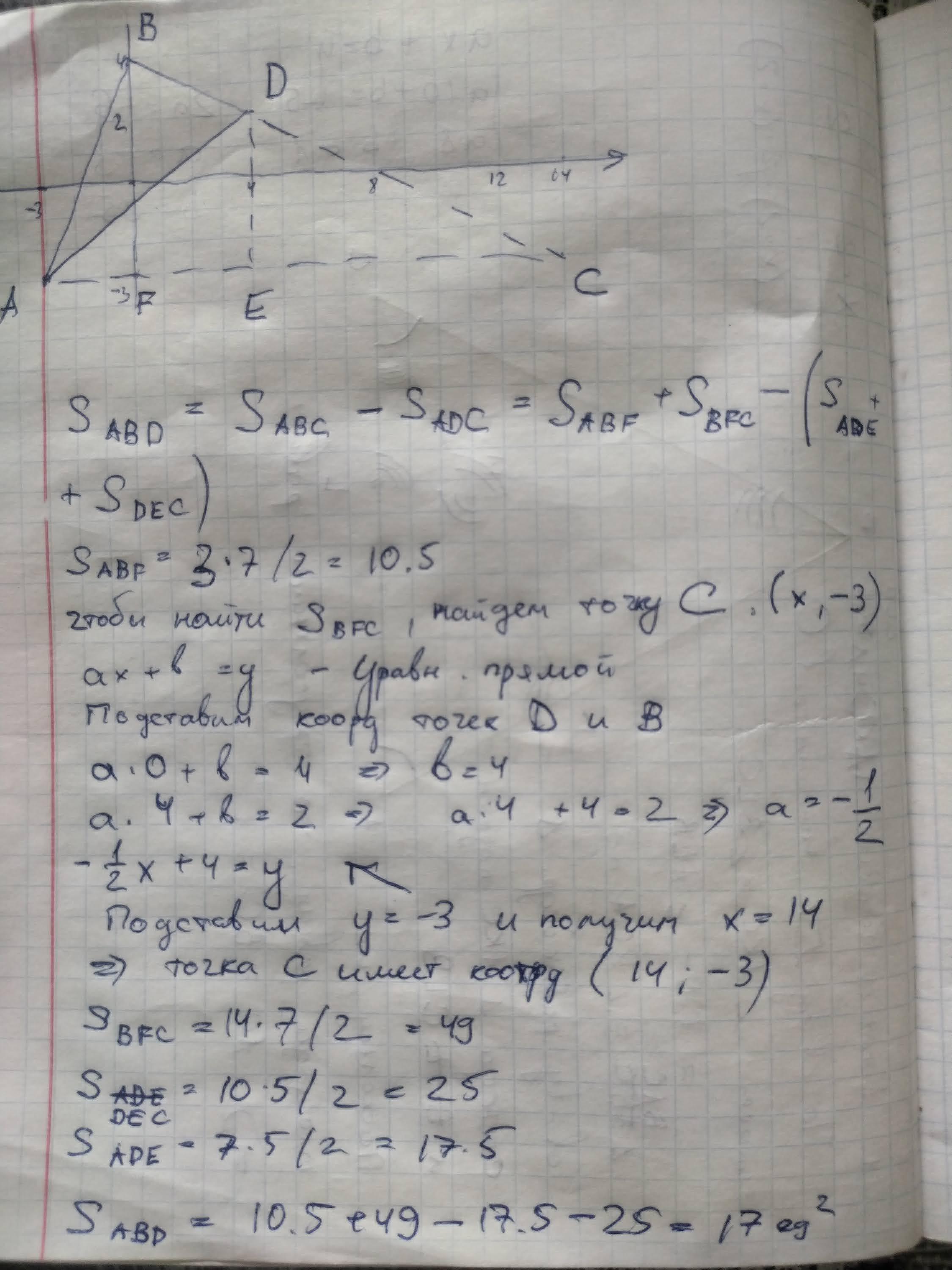 найдите площадь треугольника вершинами которого являются точки с координатами x y (-3: -3;)(0;4);(4;2)