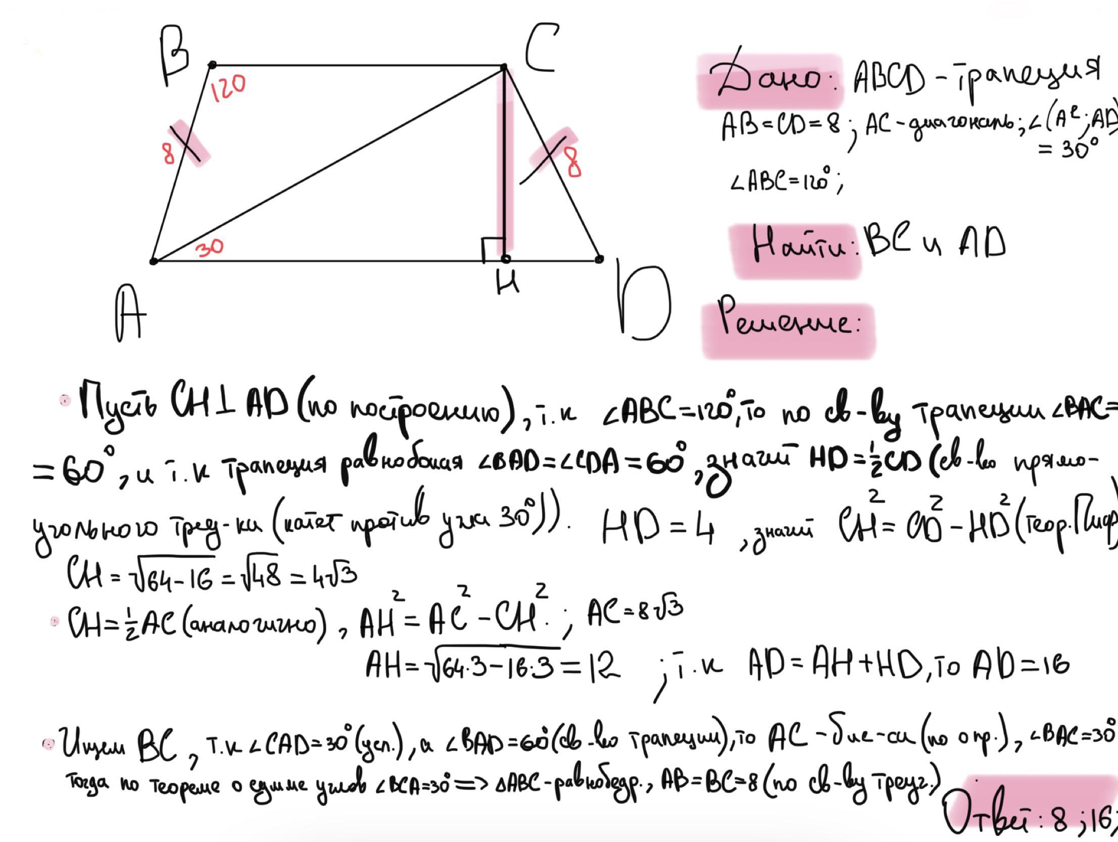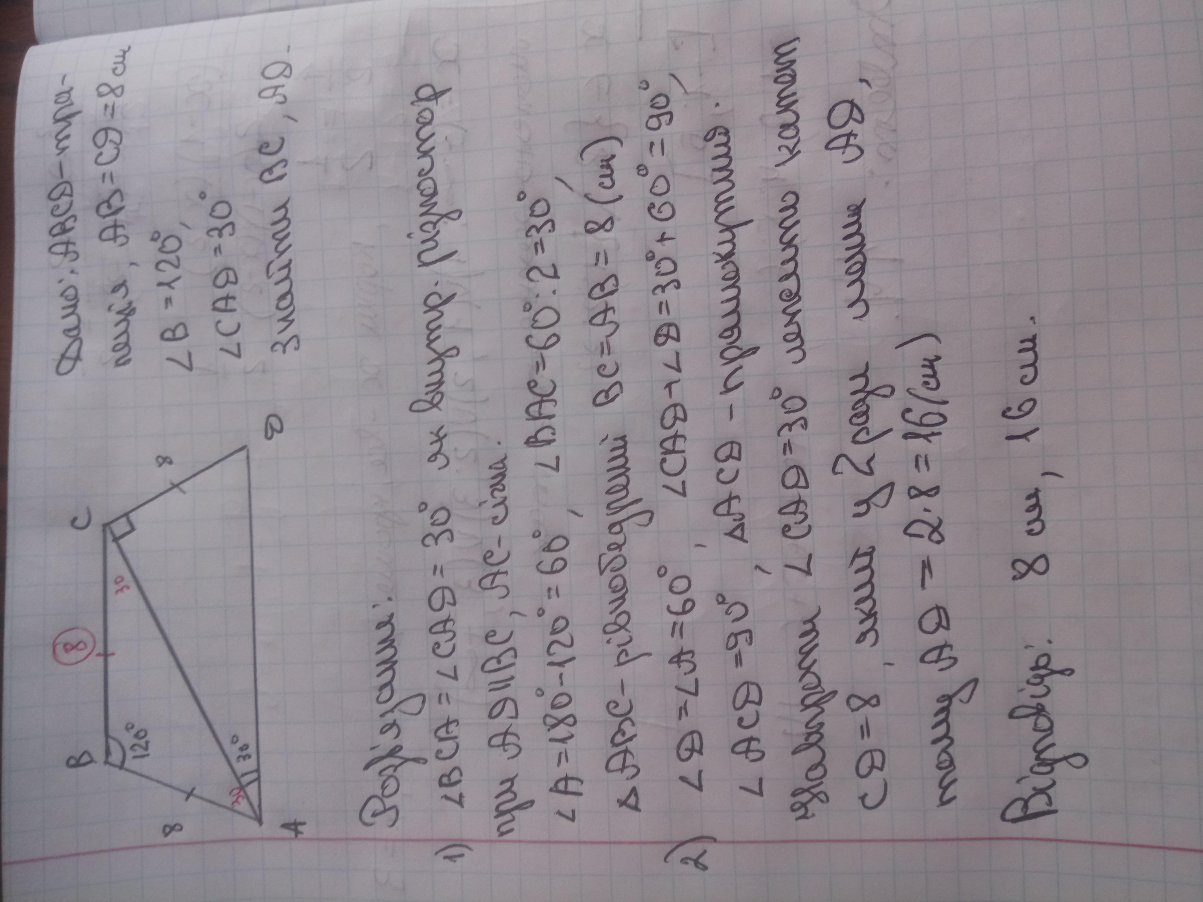у рівнобічній трапеції один із кутів дорівнює 120 градусів. Діагональ трапеції утворює з основою кут 30 градусів. Знайти основи трапеції якщо довжина бічної сторони дорівнює 8см