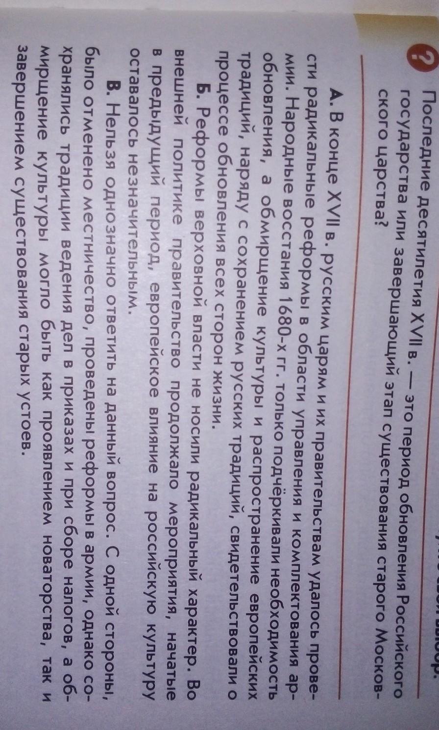 Вариант А не подходит в виду того, что в конце XVII века не проводились "радикальные реформы в области управления и комплектования армии". Если имеется в виду введение полков нового (иноземного) строя, то их формирование датируется не ранее 1630-х годов. Преобразования Петровского периода начинаются с начала XVIII века, о чем свидетельствует установление системы военных, статских, гражданский, придворных чинов - "табель о рангах". Упоминаемые "народные восстания" охватывали в основном часть стрелецких полков, поэтому говорить о "народных" волнениях некорректно. Касаемо обновления "всех сторон жизни" за счет распространения европейских традиций, наряду с сохранением русских стоит отметить, что данные преобразования в основном исходят из периода царствования Петра I, как таковых серьезных реформ в области культуры не были проведены (за исключением царевны Софьи, которая учредила Славяно-Греко-Латинскую академию в 1686 году).