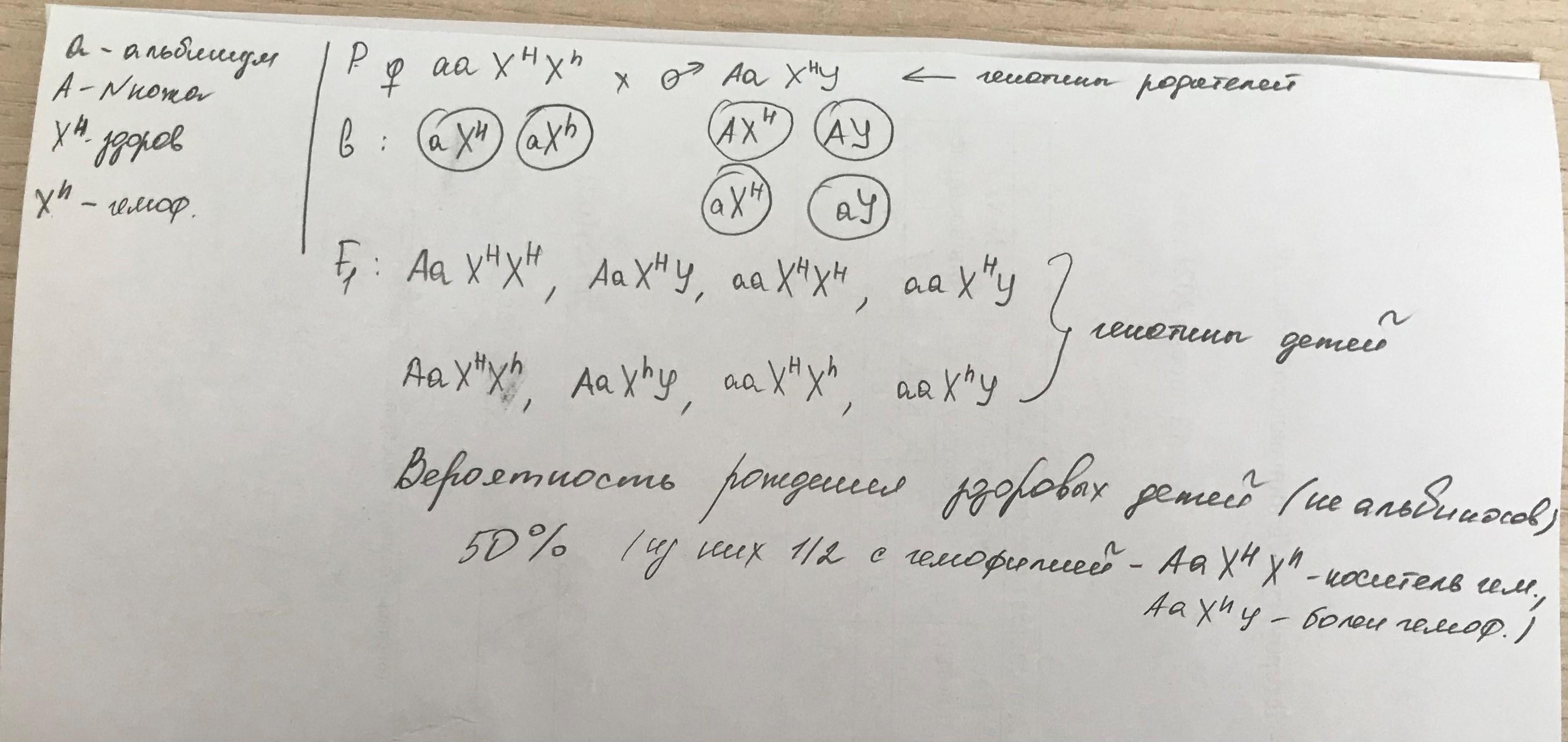 У человека ген альбинизма (а) наследуется как рецессивный аутосомный признак, а ген гемофилии(не свертываемость крови) - рецессивный признак, сцепленный с X- хромосомой. Женщина альбинос, отец которой страдал гемофилией выходит замуж за здорового мужчину не альбиноса, гетерозиготного по признаку альбинизма. Определите генотипы родителей и возможного потомства. Составьте схему решения задачи. Определите вероятность рождения в этой семье здоровых детей не альбиносов.