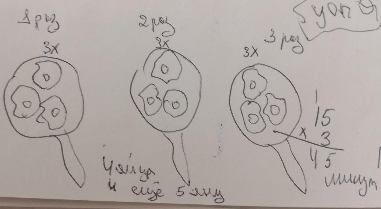 3 яйца жарятся и проходит 15 мин, потом ещё 3 яйца и 15 мин, и крайний раз 3шт по 15 мин тут даже не про кол-во, я не знаю, что это такое