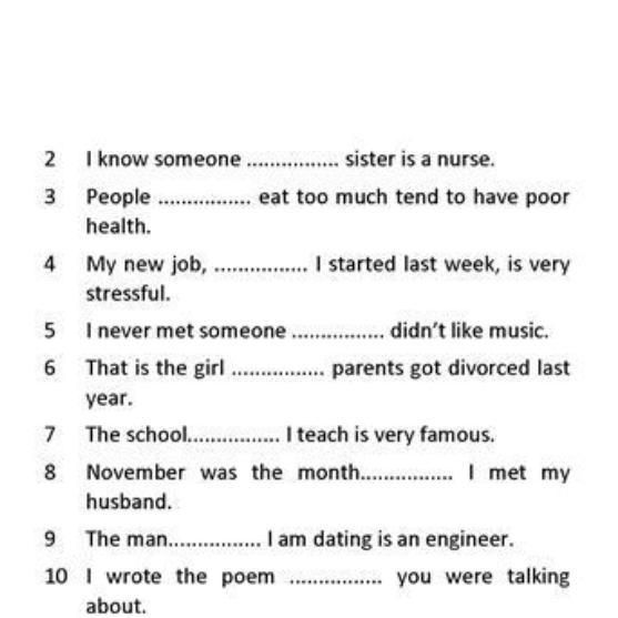 The book (which) I was reading was very interesting. 1 The man... I saw yesterday is 99. 2 I know someone . sister is a nurse. 3 People. eat too much tend to have poor health. 4 My new job, I started last week, is very stressful. 5 I never met someone didn't like music. 6 That is the girl . parents got divorced last year. 7 The school.. . I teach is very famous. 8 November was the month.. . I met my husband. 9. The man... I am dating is an engineer. 10 I wrote the poem ... you were talking about.