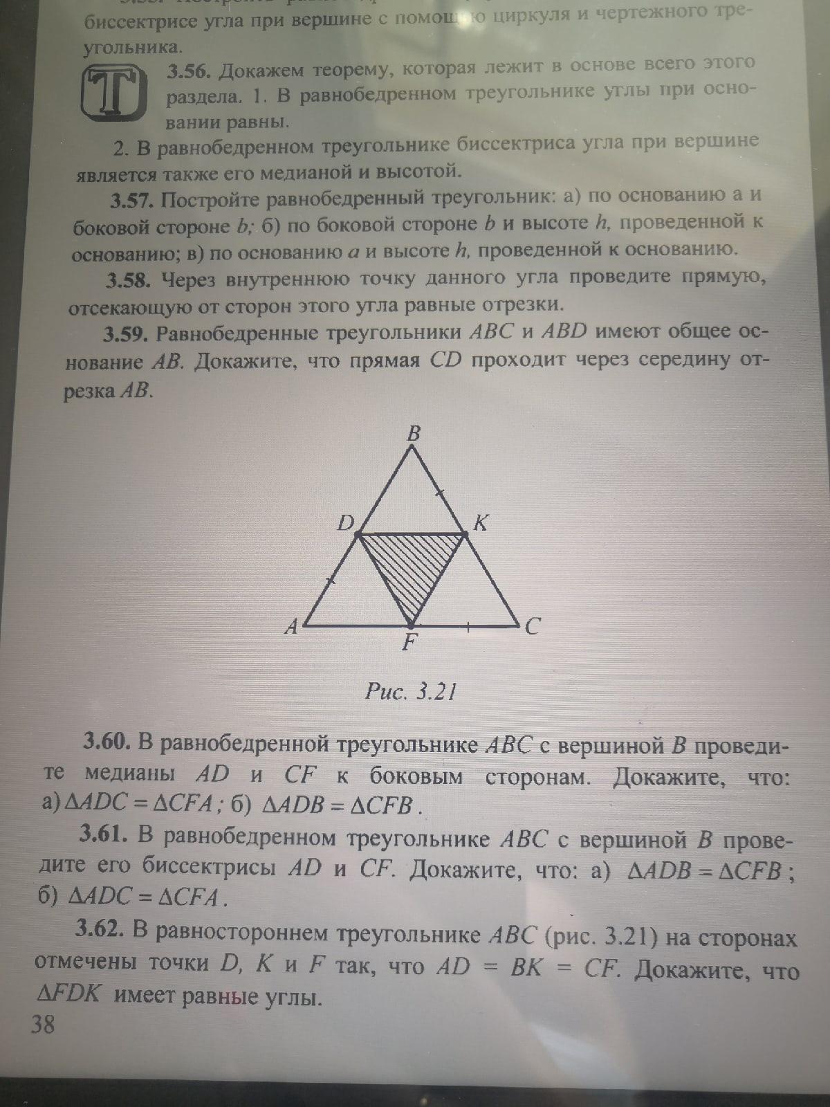 В равностороннем треугольнике АВС ( рис. 3.21 ) на сторонах отмечены точки D, K и F так, что AD = BK = CF. Докажите, что FDK имеет равные углы