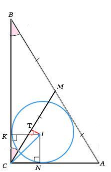 Назовем треугольник АВС. Искомое расстояние - длина отрезка IT, проведенного из центра окружности перпендикулярно медиане.