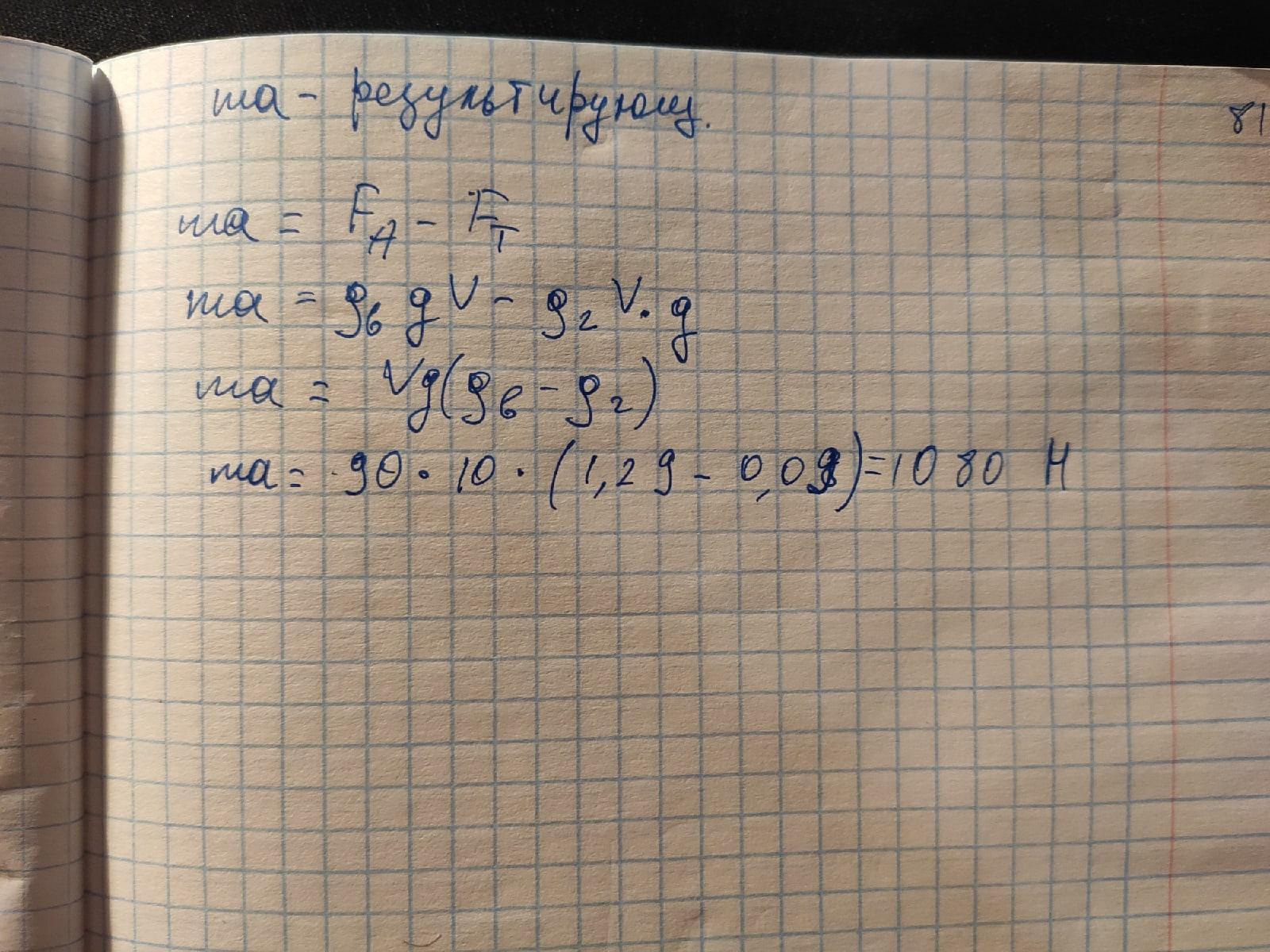 1. Масса воздушного шара, заполненного водородом, равна 40кг. Какова результирующая сила, действующая на шар, если объем шара 90м куб (H)? ро(воз)=1,29 кг/м куб, g=10H/кг