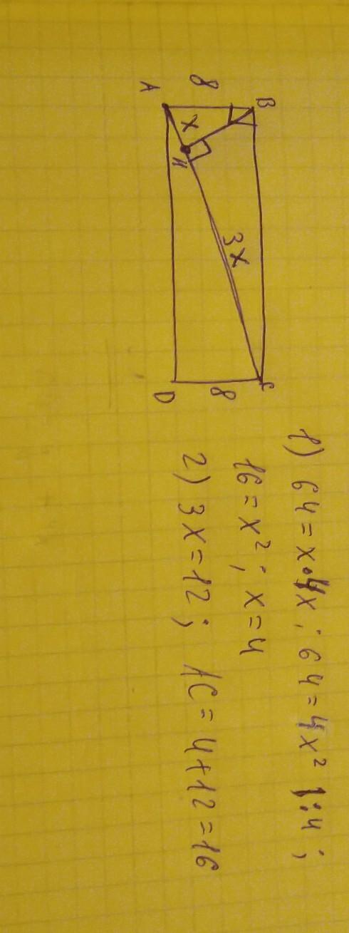 Перпендикуляр, опущений з вершини прямокутника на його діагональ, ділить її на частини, одна з яких у 3 рази більша за іншу. Обчисліть довжину діагоналі, якщо менша сторона прямокутника дорівнює 8 см
