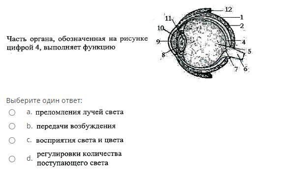 3. Если я не ошибаюсь, на рисунку под номером 4 обозначена сетчатка и она выполняет функцию с) восприятие света и цвета