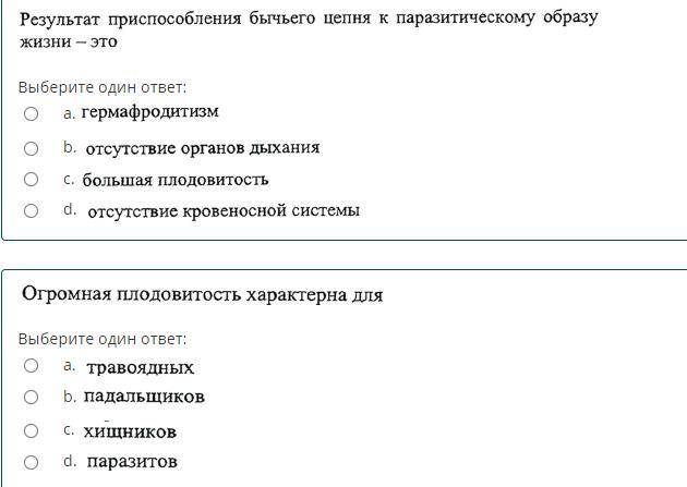 1. Результат приспособления бычьего цепня к паразитическому образу жизни — это с) большая плодовитость.