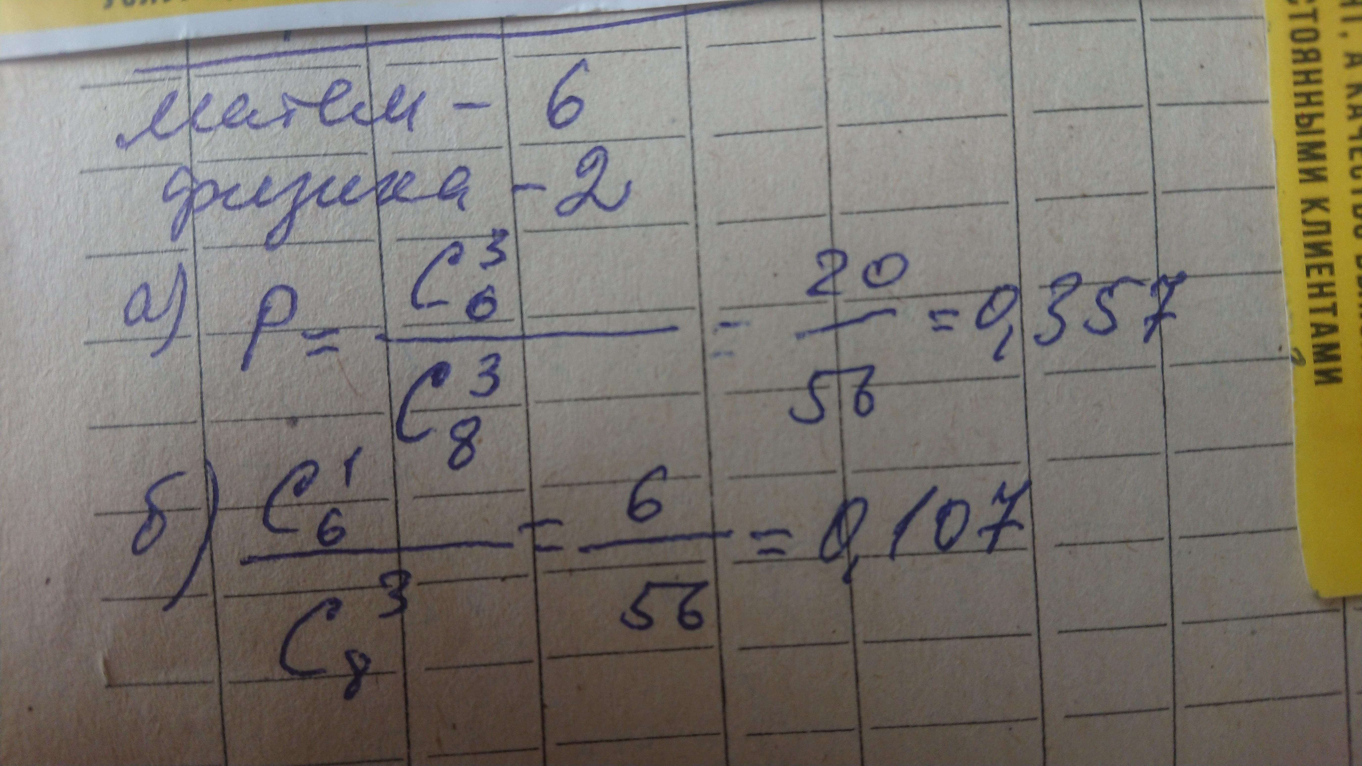 На полке 8 книг. Книг по математике в 3 раза больше, чем книг по физике. Наугад взяли 3 книги. Найти вероятность того, что : a) все взятые книги по математике б) 2 книги по физике и 1 по математике
