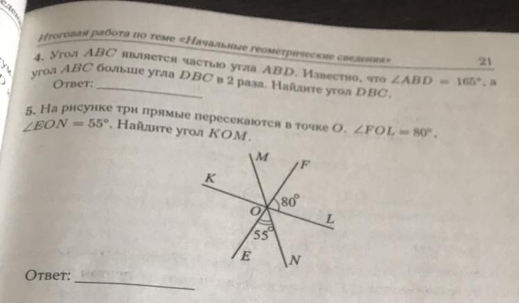 KOE=FOL=80° как вертикальные. MOF=EON=55° как вертикальные. KOE + FOL + MOF + EON = 80°+80°+55°+55°=270°. 360°-270° = 90°. Значит, KOM+LON = 90°. KOM=LON как вертикальные. Значит, KOM=90° : 2= 45°.