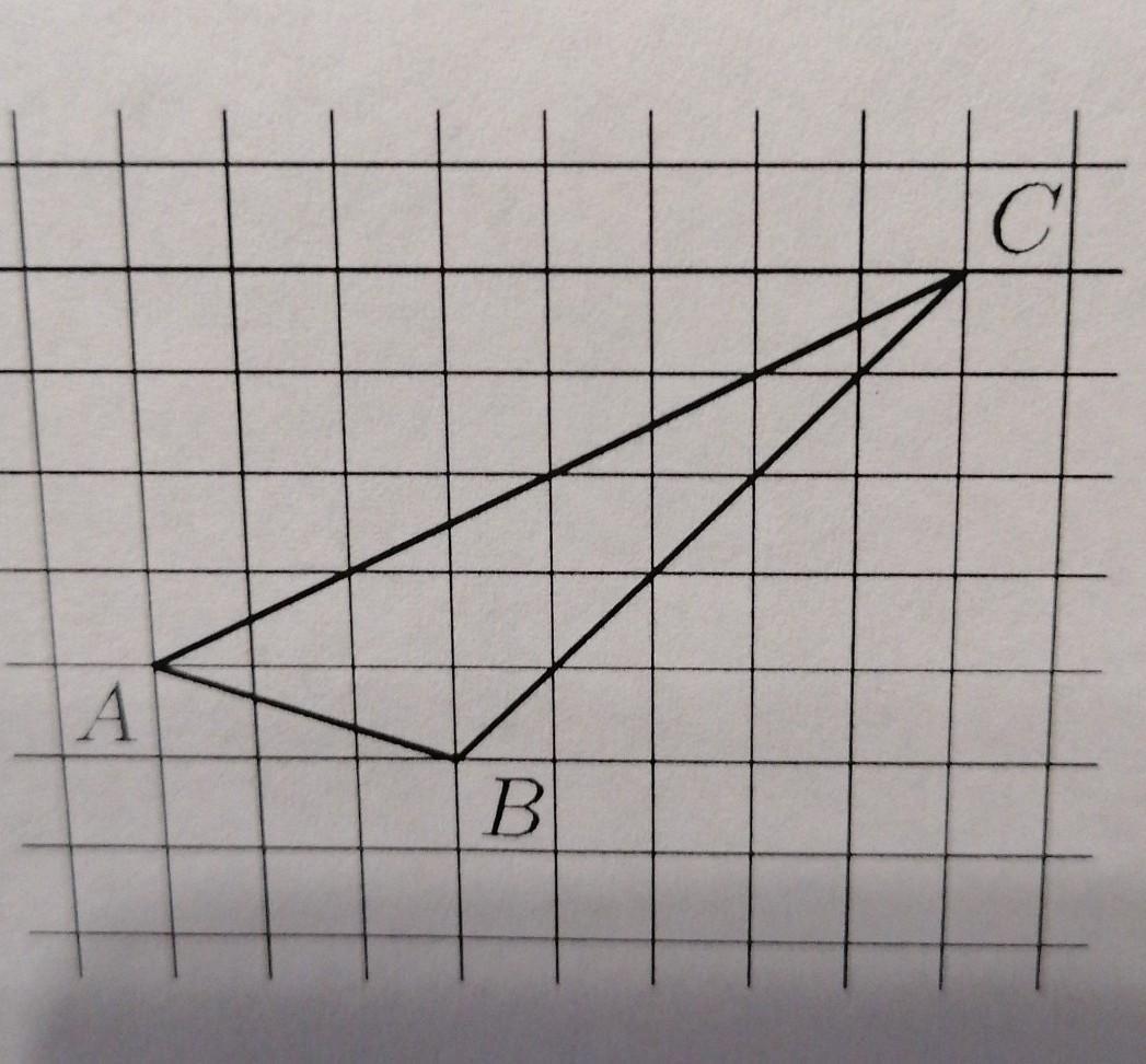 На клетчатой бумаге с размером клетки 1x1 изображён треугольник ABC. Во сколько раз сторона AB меньше высоты, проведённой к этой стороне?