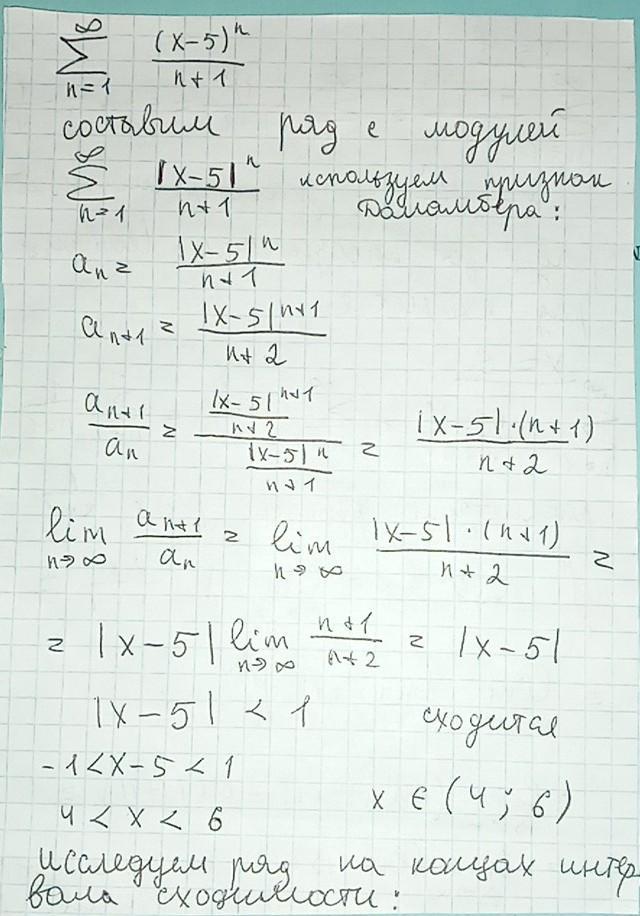 на концах интервала сходимости при х=4 ряд сходится, при х=6 ряд расходится
