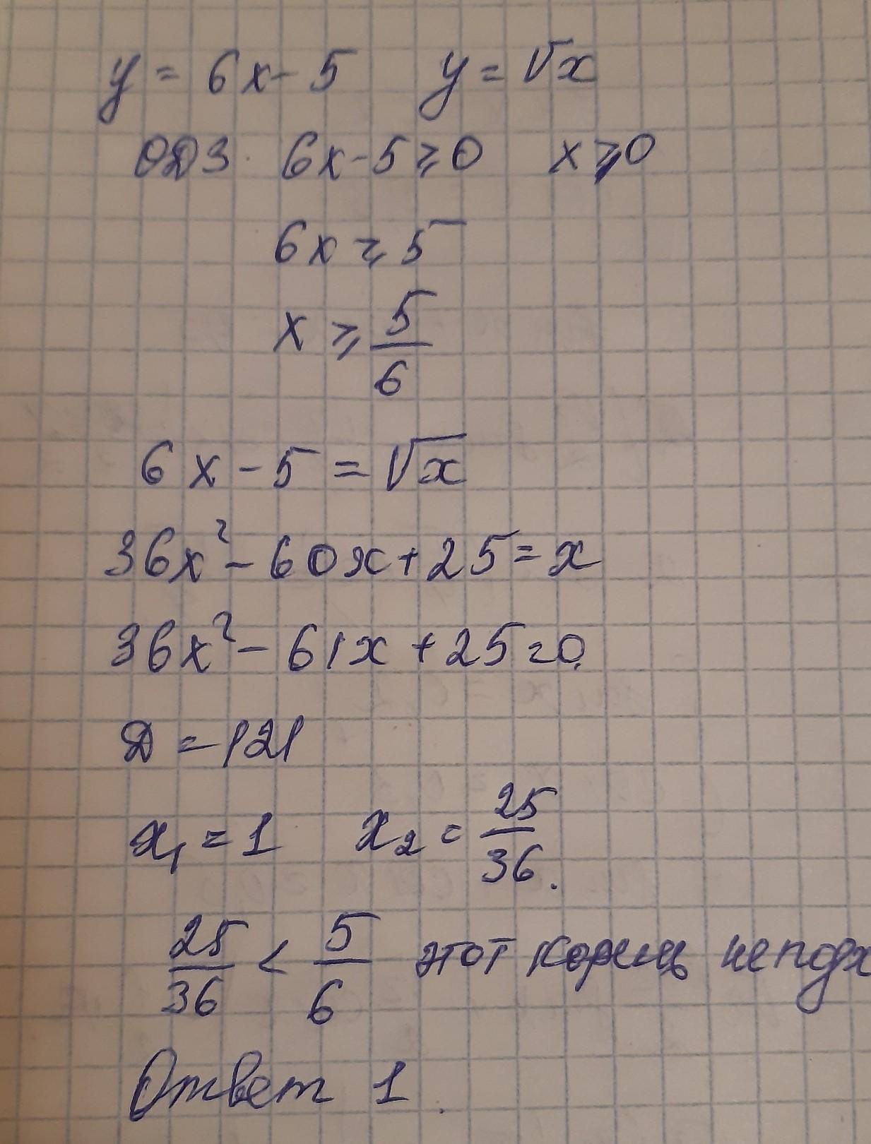 Найдите сумму абсцисс точек пересечения графиков функции y=6x-5 и y=√х