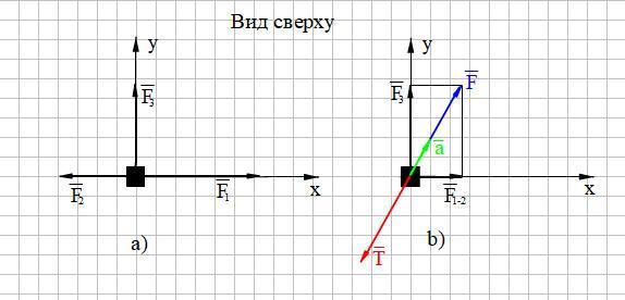 Сила Т натяжения верёвки направлена в сторону, противоположную силе F, поэтому в проекции на направление движения (см. рис. b) получаем уравнение