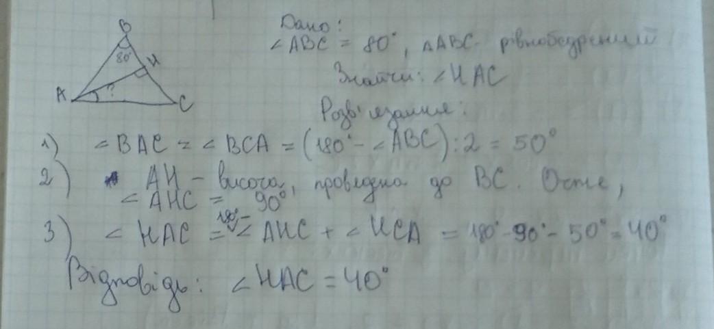 кути при вершині рівнобедреного трикутника дорівнює 80.Знайти кут між основую та висотою проведено до бічної сторони