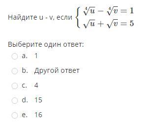 sqrt(u)+sqrt(u) - 2*u^(1/4)*v^(1/4)=1. Из второй строчки системы следует, что sqrt(u)+sqrt(u) = 5, значит 2*u^(1/4)*v^(1/4)=4, (u*v)^(1/4) = 2. Возведём в вторую степень, получим sqrt(u*v) = 4