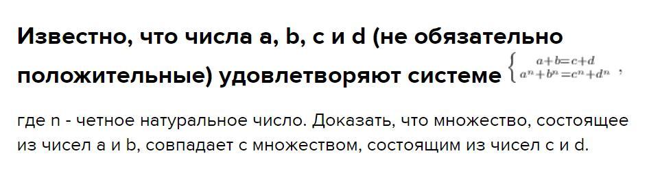 Если a=c, b=d или a=d, b=c, оба равенства выполнены. Остается доказать, что в противном случае (множества из чисел  a и b и чисел c и d не совпадают), если известно, что a+b=c+d, то  Да,  n конечно должно быть четным.