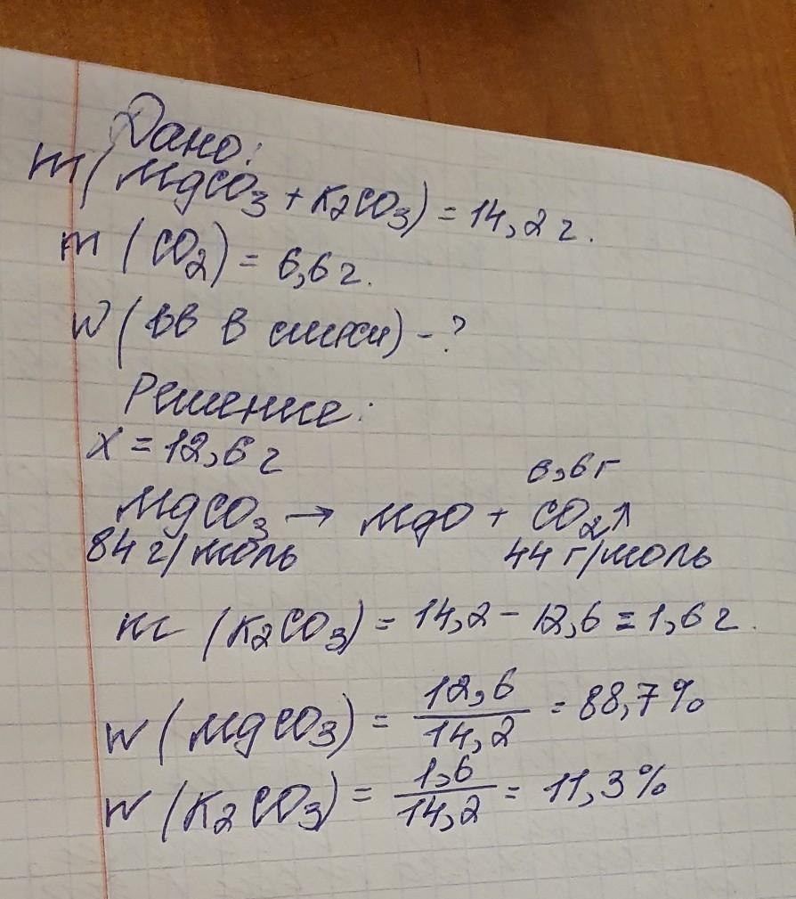 При разложении 14,2 г смеси карбонатов кальция и магния выделилось 6,6г оксида углерода (IV). Определите массовую долю (в %) карбонатов кальция и магния в смеси. Объясните через пропорции а не через уравнения и еще не отправляйте мне те варианты которые сделали другие