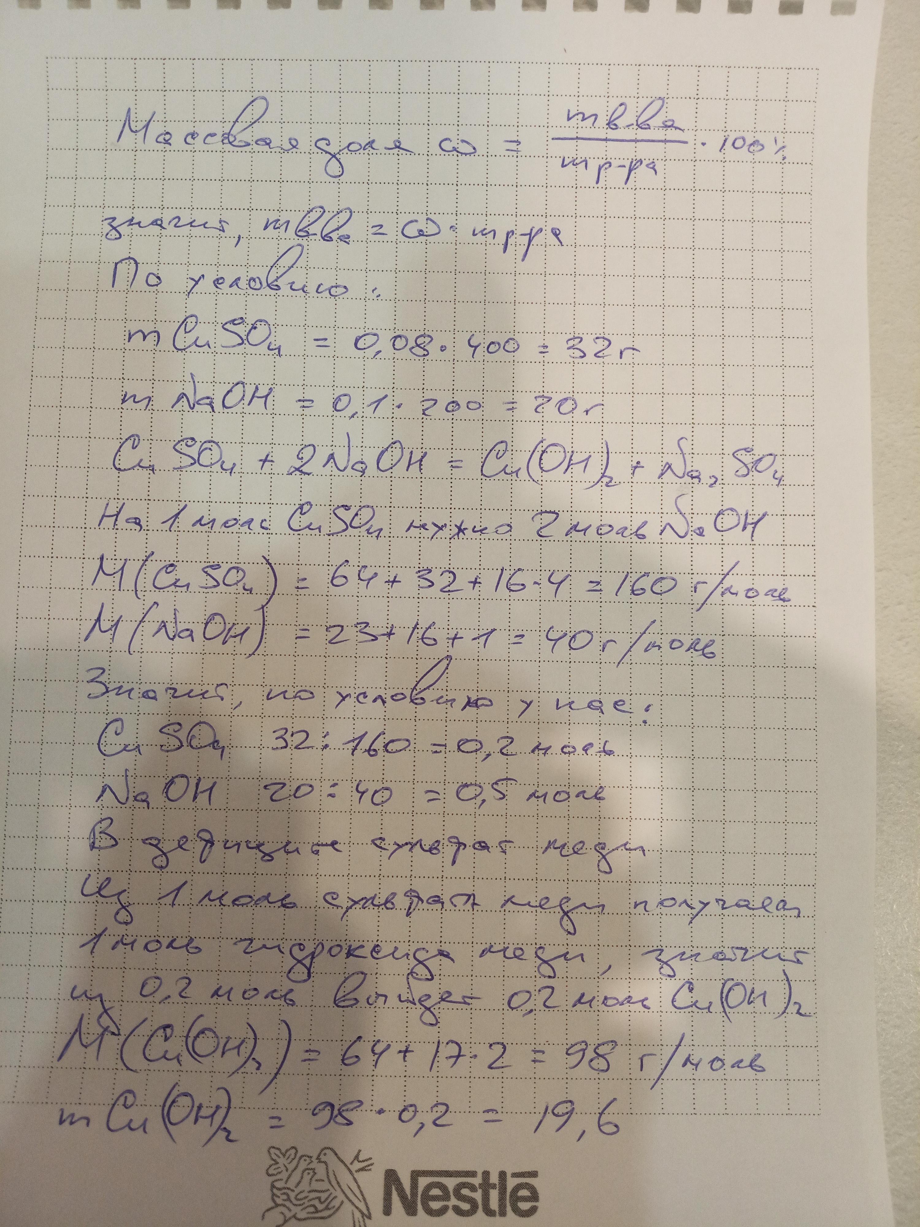 Рассчитайте массу осадка который образуется если К раствору массой 400 г с массовой долей сульфата меди равна 8% добавили раствор массой 200 г в котором массовая доля гидроксида натрия составляет 10%