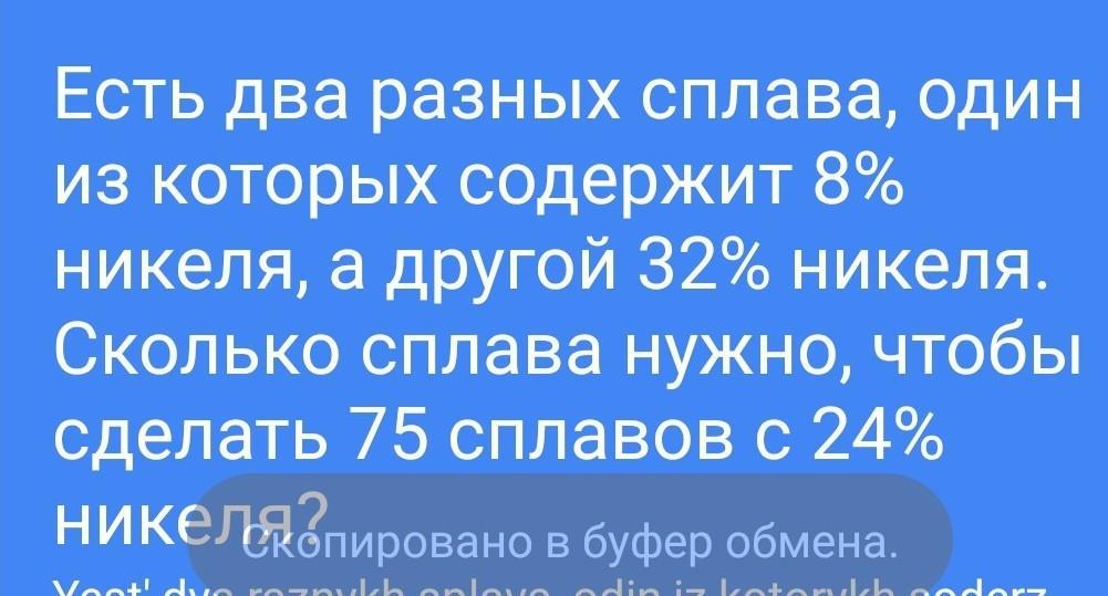 Никеля в первом сплаве 0,08•х г, во втором сплаве - 0,32•у г, всего - (0,08•х + 0,32у) г. По условию в получившемся сплаве 0,24•75 = 18 (г) никеля. Составим уравнение: 0,08•х + 0,32у = 18.