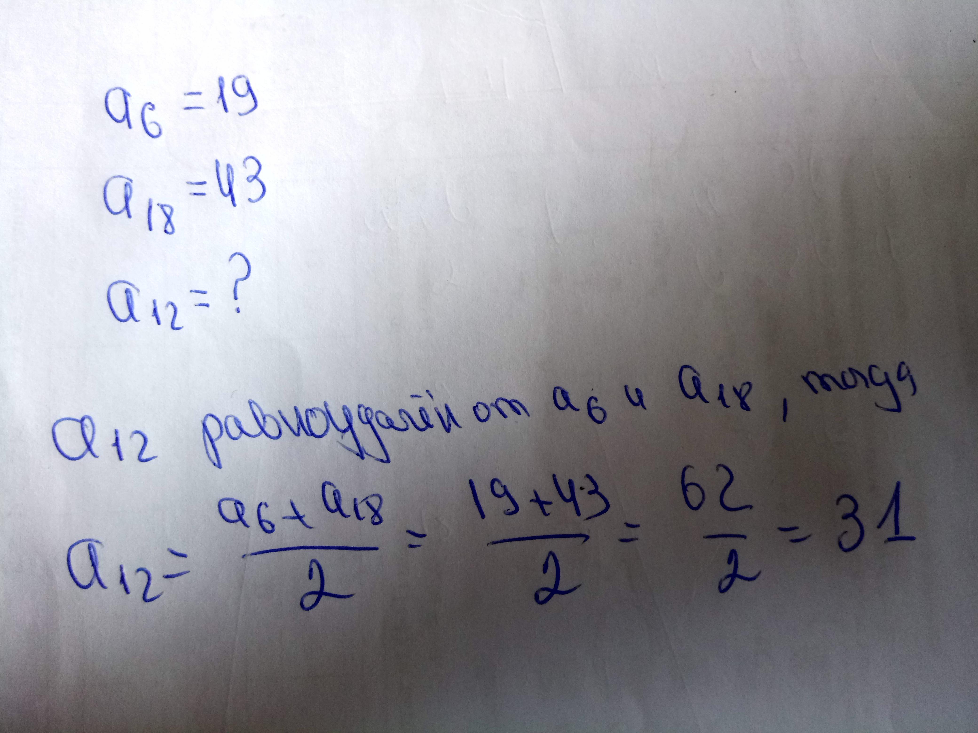 В арифметической прогрессии а6=19; а18=43. Найдите а12