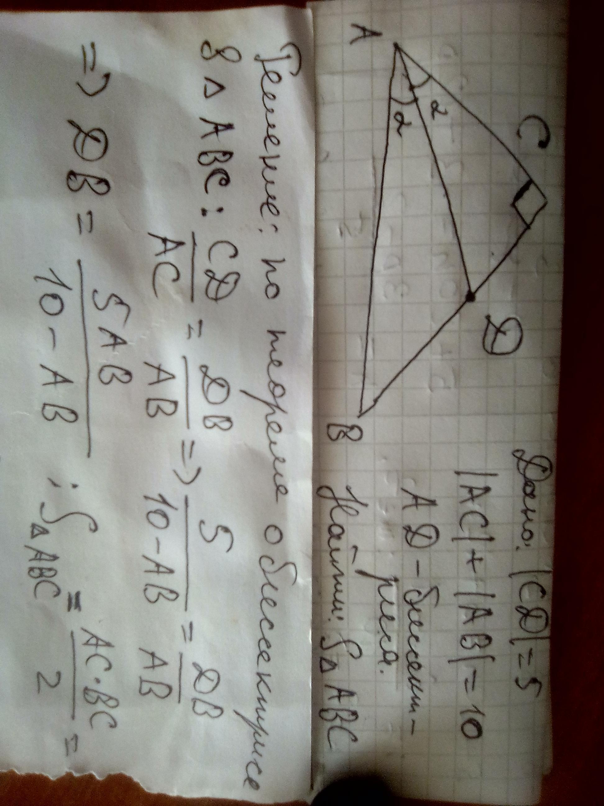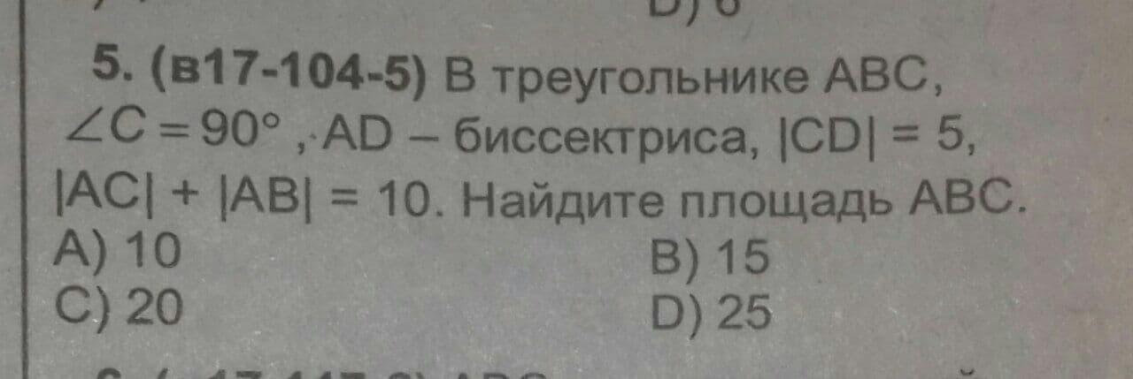 В треугольнике ABC угол C = 90 градусов, AD - биссектриса, CD = 5, AC+AB=10. Найдите площадь ABC.