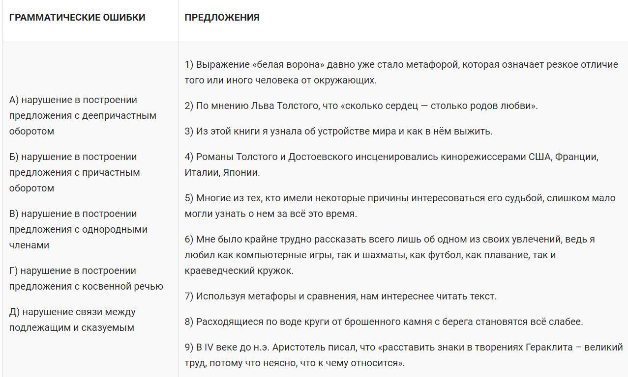 Установите соответствие между грамматическими ошибками и предложениями, в которых они допущены: к каждой позиции первого столбца подберите соответствующую позицию из второго столбца.