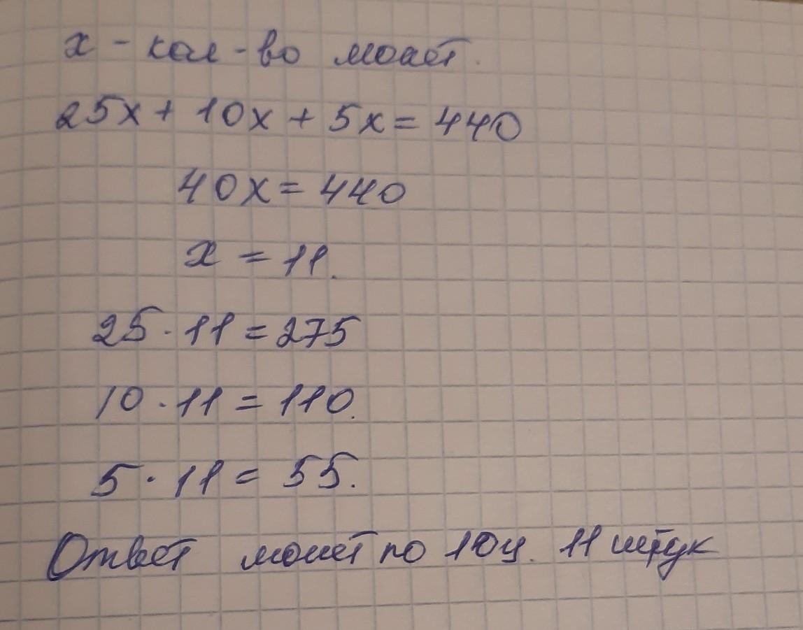 У вас есть монеты по 25, 10 и 5 центов. Общая сумма ваших денег составляет 4,40 доллара (440 центов). У вас одинаковое количество монет каждого типа. Сколько у вас монет по 10 центов?