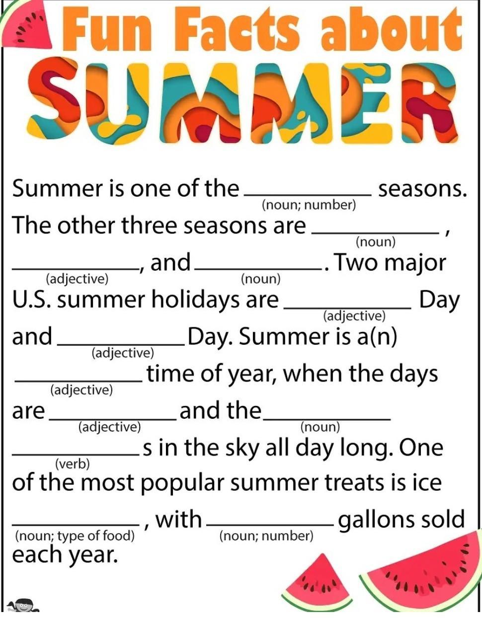 Summer is one of the (noun; number) FOUR seasons. The other three seasons are (noun) AUTUMN, (noun) WINTER and (noun) SPRING. Two major U.S. summer holidays are (adjective) INDEPENDANCE Day and (adjective) FATHER'S Day. Summer is a (adjective) HOT time of year, when the days are (adjective) LONG and the (noun) SUN (verb) SHINES in the sky all day long. One of the most popular summer treats is (noun; type of food) ICE-CREAM, with (noun; number) MILLION gallons sold each year.