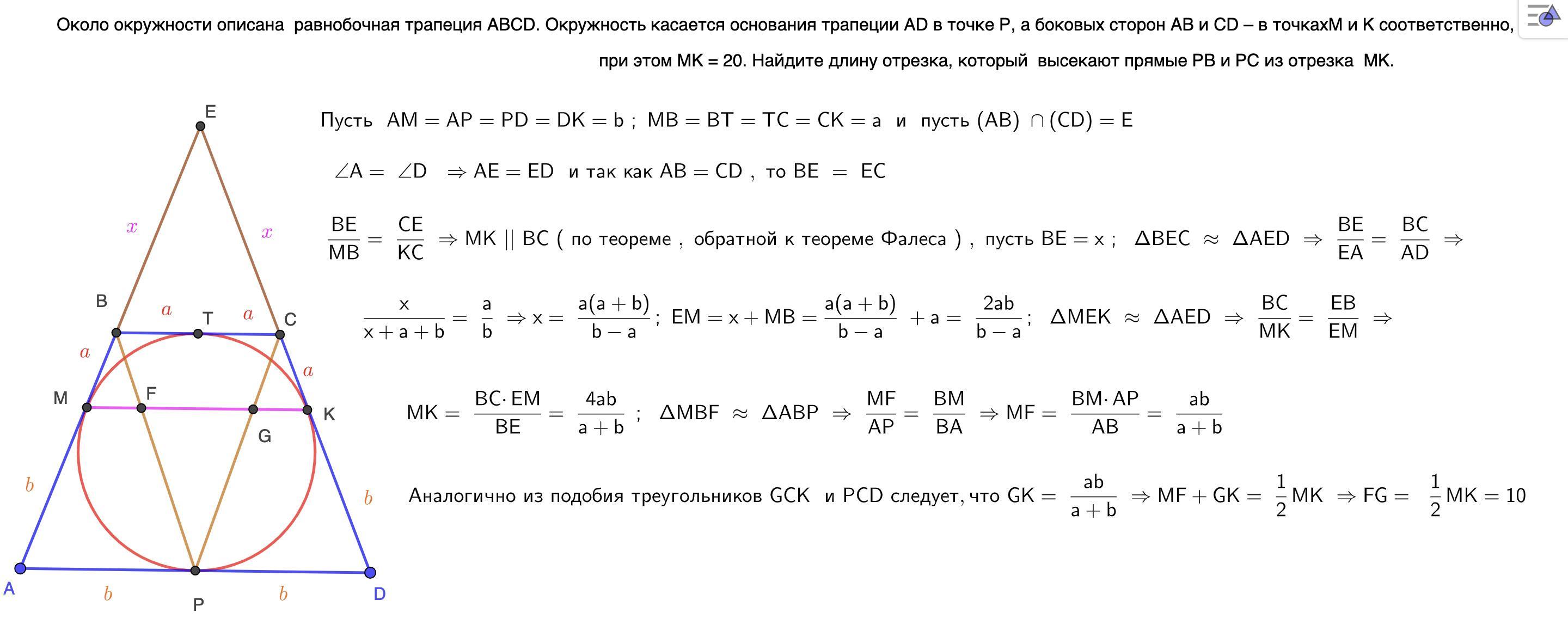 М и K соответственно, при этом MK = 20. Найдите длину отрезка, который