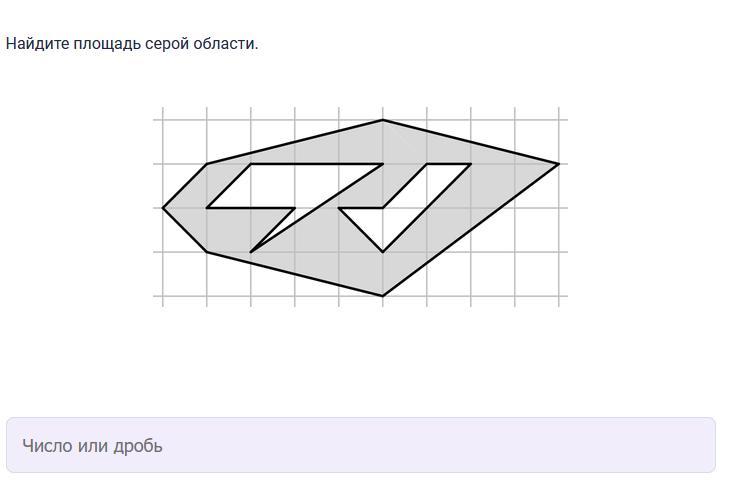 Если применять теорему Пика, то по частям. A) Вся фигура по внешнему контуру: внутренних 19, граничных 6, S=19+6/2-1=21. B) Белая слева: В=0, Г=8, S=0+8/2-1 =3. C) Белая справа: В=0, Г=6, S=0+6/2-1=2. D) ИТОГО: 21-3-2=16