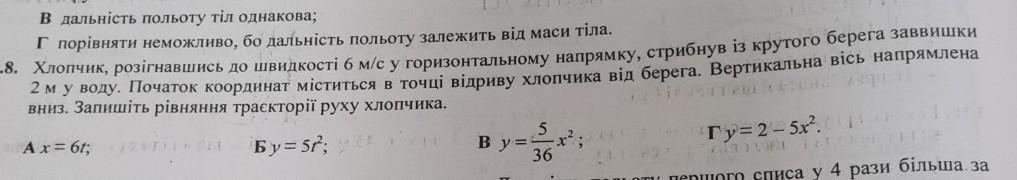 хлопчик, розігнавшись до швидкості 6 м/с горизонтальному стрибнув із крутого берега заввишки 2м у воду. Початок координат міститься в точці відриву хлопчика від берега. Вертикальна вісь направлена вниз. Запишіть рівняння траєкторії руху хлопчика