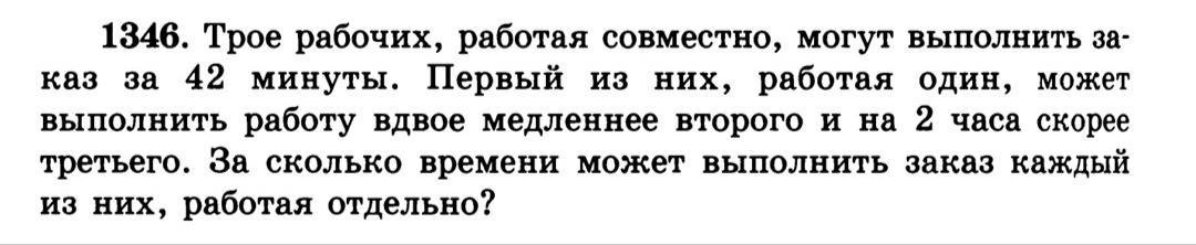да, вы все брали в часах а 42 взяли в минутах. и потом, зачем 1/3? первый за час делает 1/х, второй 1/2х и третий 1/(х-2) всё это складываем и получаем 42/60 или 7/10.