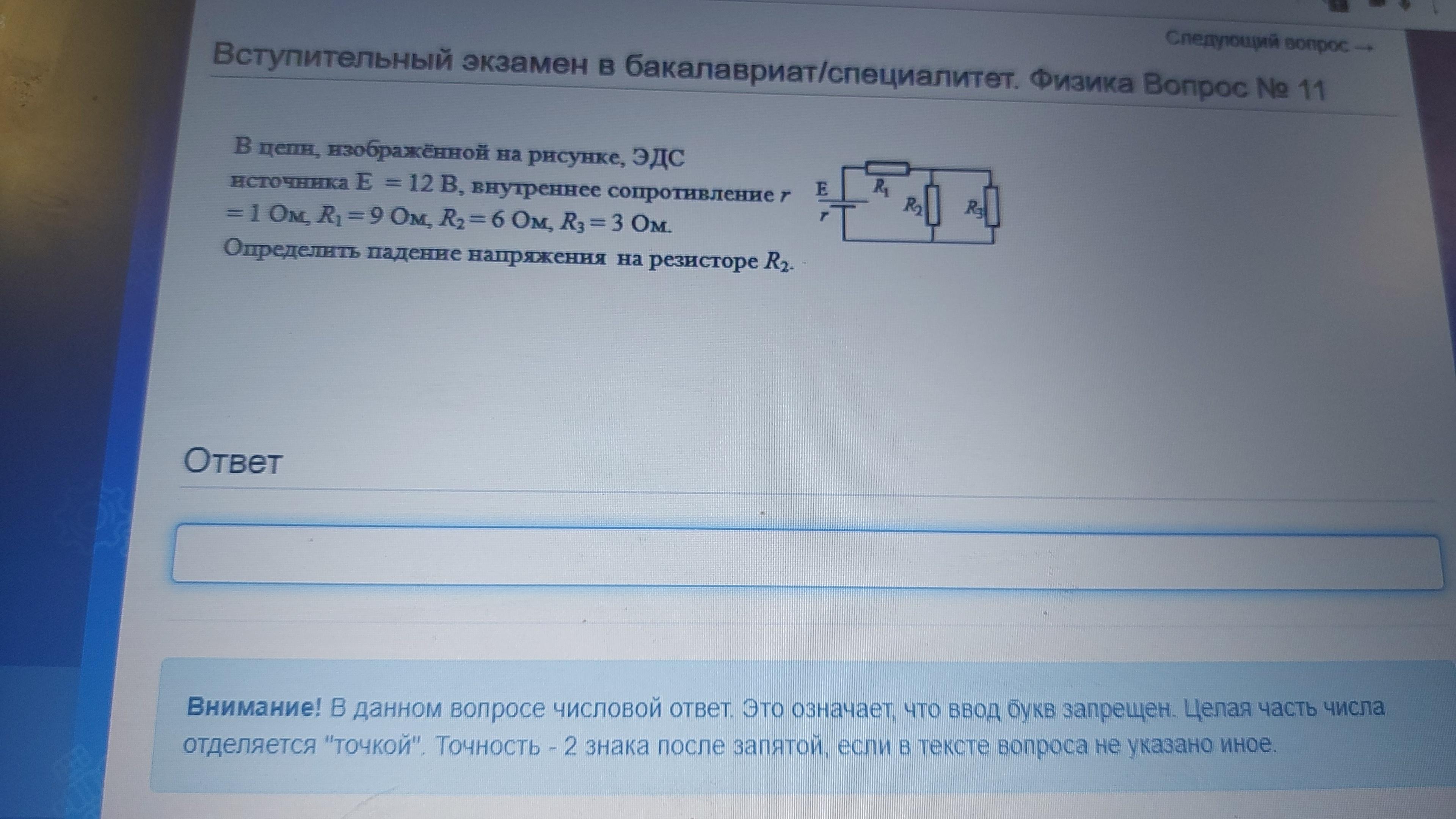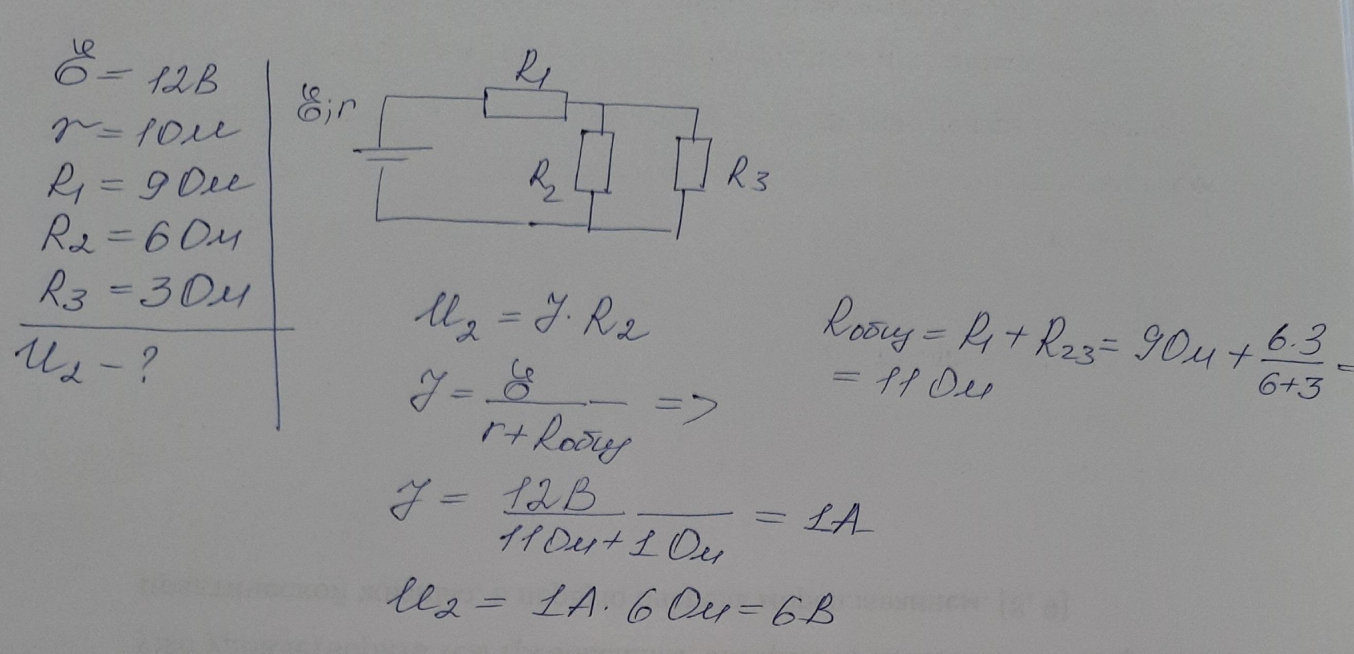 в цепи изображенной на рисунке эдс источника E=12B, внутреннее сопротивление y=1Om,R=9 Om,R=6Om,R=3Om.Определить падение напряжения на резистореR2
