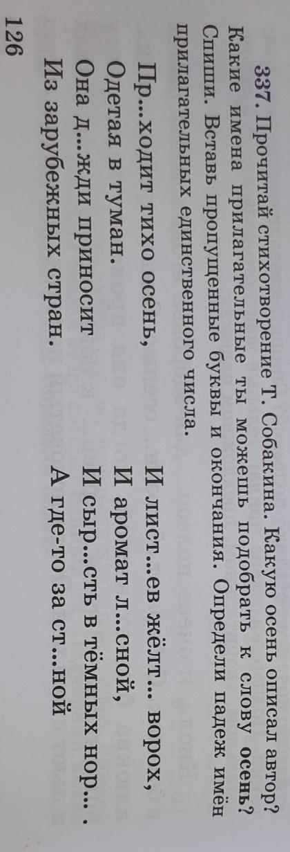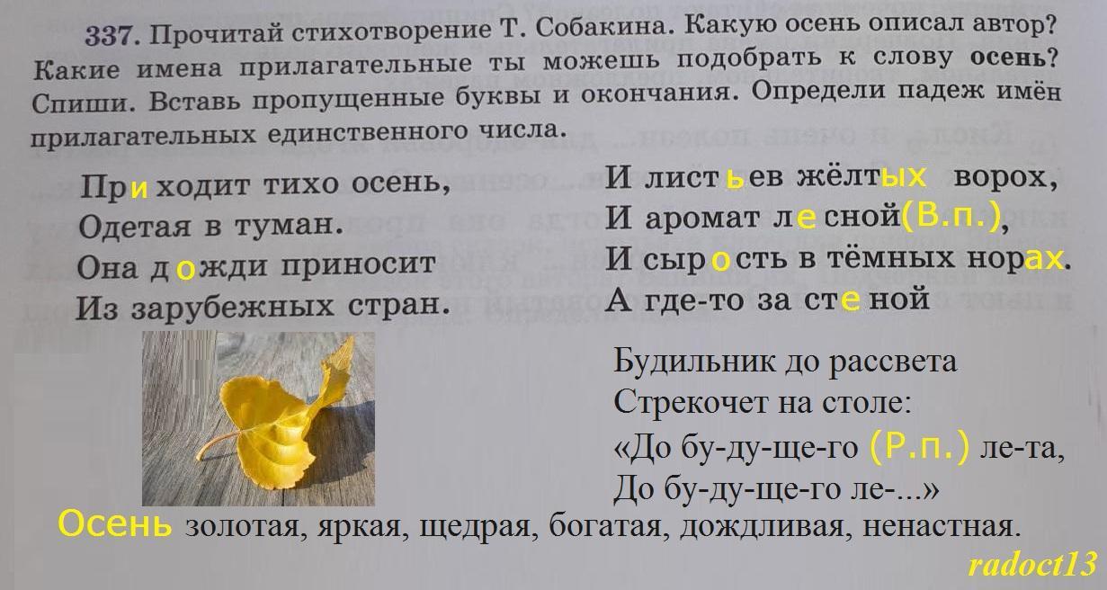 Прочитай стихотворение Т . Собаки на. какую осень описал автор ? Какие имена прилогательные ты можешь подобрать к слову осень ? [ устно , можно не делать ] Спиши . Все во популярные буквы окончания . Определи падеж прилогательных единственного числа .