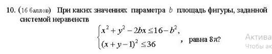 Теперь разберемся с первым неравенством системы: Поскольку это окружность радиуса 4, то ее площадь будет равна . Данная окружность лежит внутри прямых, где при различных значениях b мы ее можем передвигать вдоль оси абсцисс, тем самым меняя ее площадь. Необходимо указать те значения параметра b при которых площадь будет равна