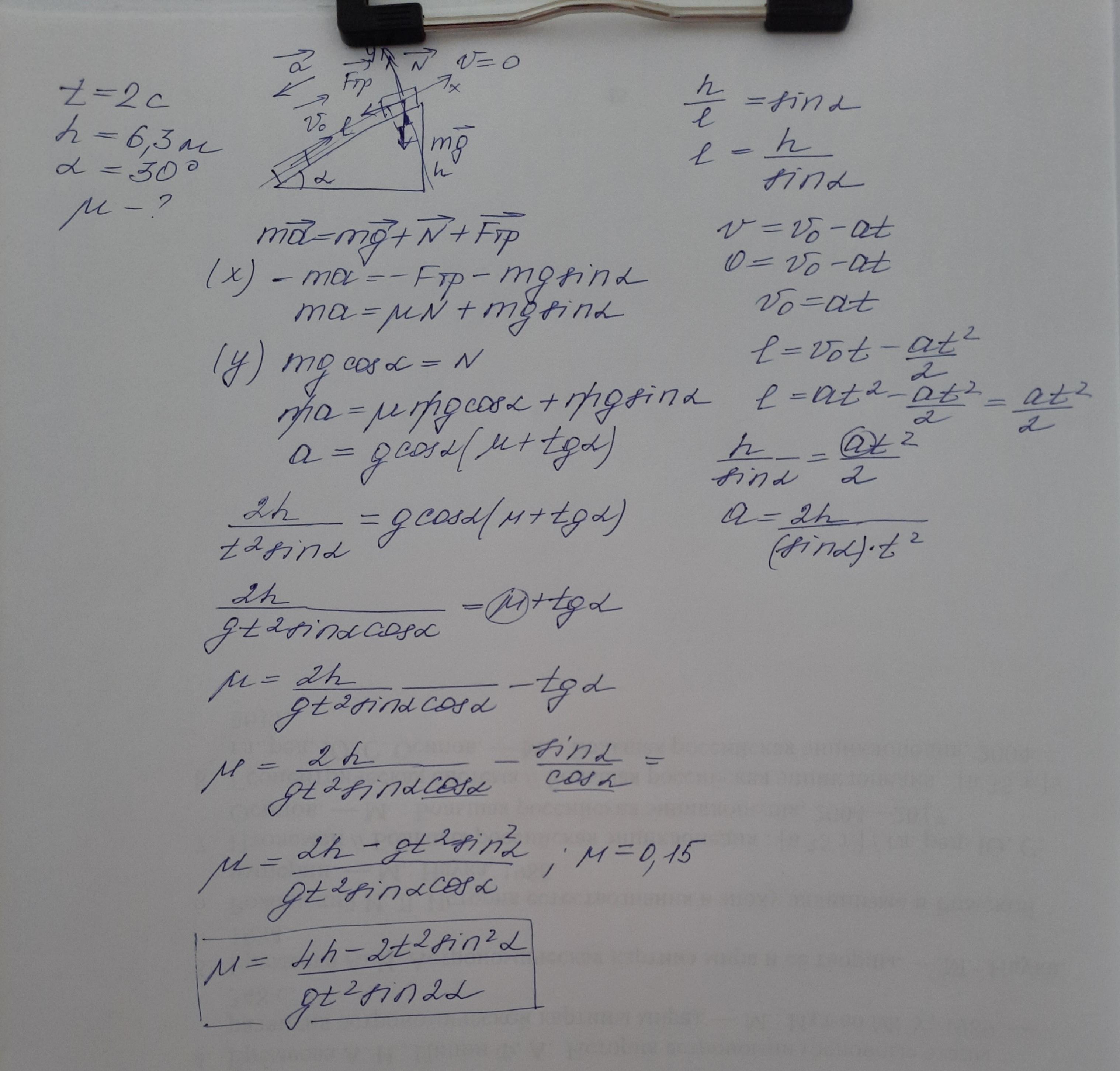 небольшому телу находящемуся у основания наклонной плоскости сообщили скорость v0 направленную вдоль плоскости. в результате тело за 2с поднялось на высоту 6.3м угол наклона плоскости к горизонту 30. определить коэф трения тела о плоскости