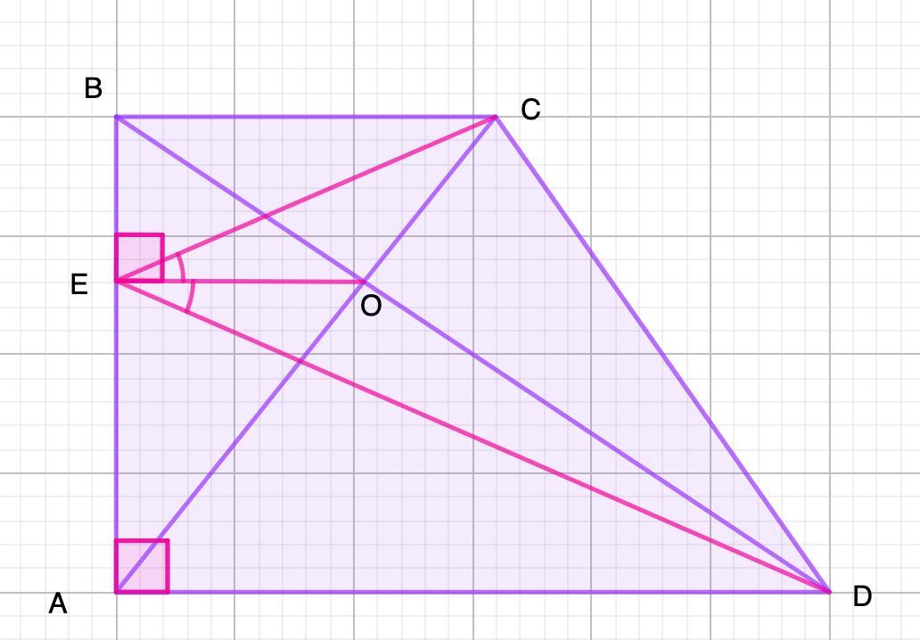 В прямоугольной трапеции ABCD диагонали AC и BD пересекаются в точке О. Из точки О проведен перпендикуляр OE к стороне AB. Докажите, что углы CEO и DEO равны.