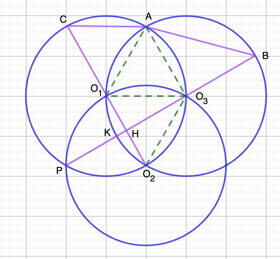 Так как три окружности проходят через центры друг друга ⇒их радиусы равны. Пусть радиусы всех окружностей равны R.