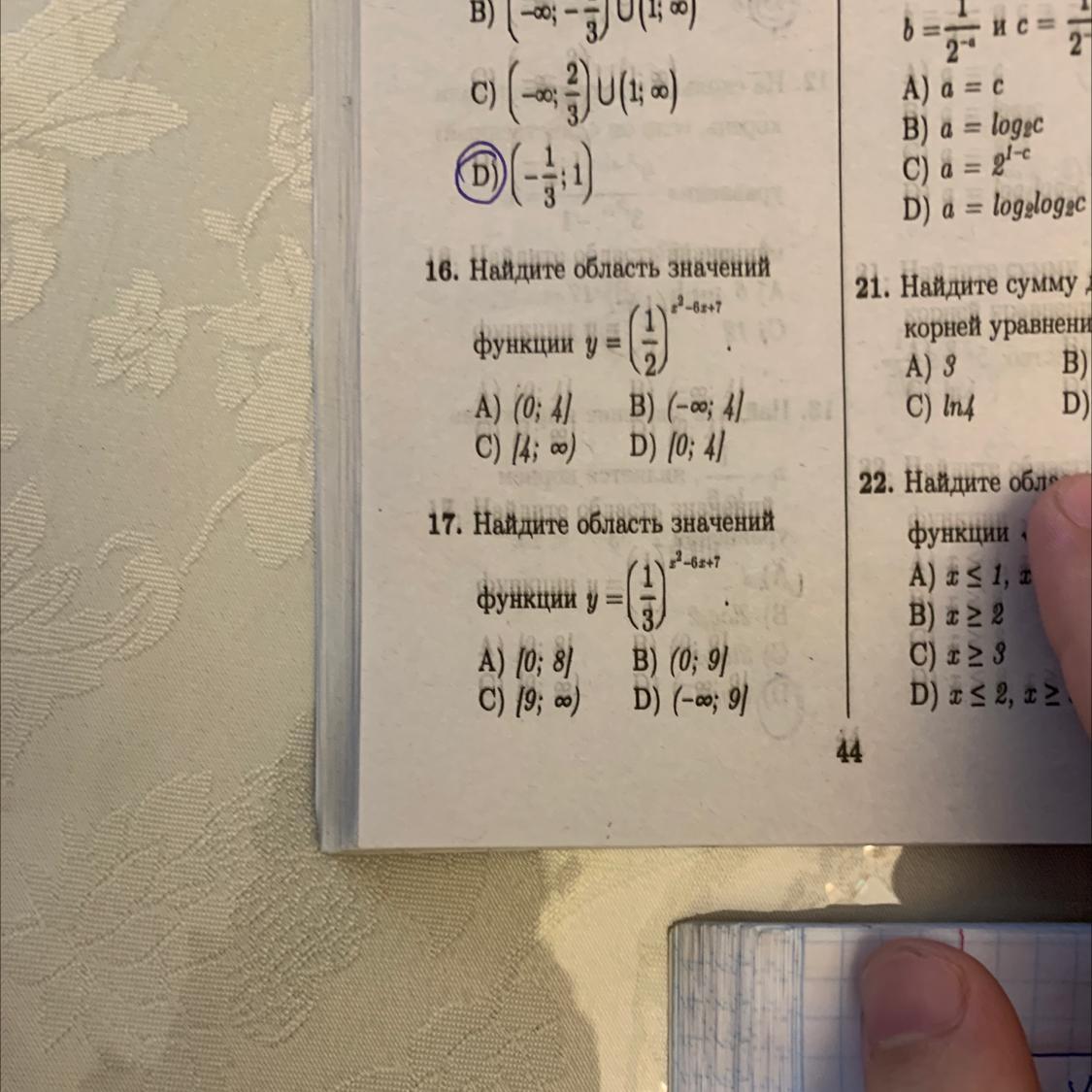 Значит 1/2 и 1/3 x→±∞ стремится к 0 и это будет нижняя граница значений функций (но не достижимая). а максимум достигается, когда показатель степени = -2 - это 4 для 16 задания и 9 для 17 задания.
