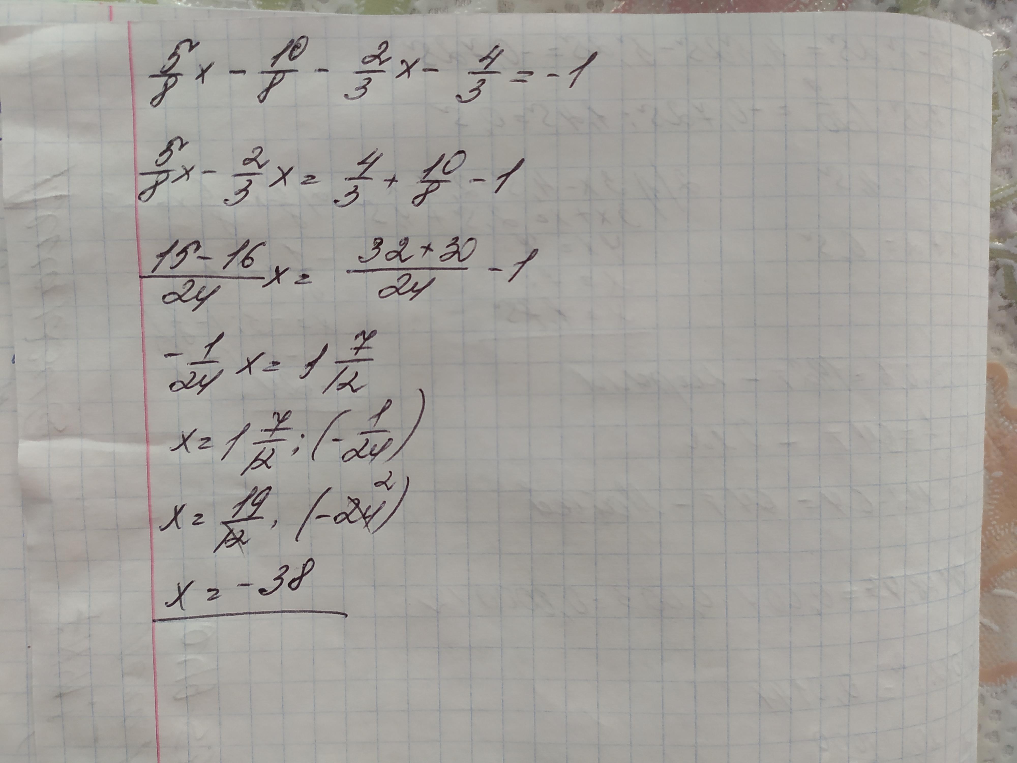5/8 × (x-2) - 2/3 × (x+2) = -1 - домножим уравнение на 24
