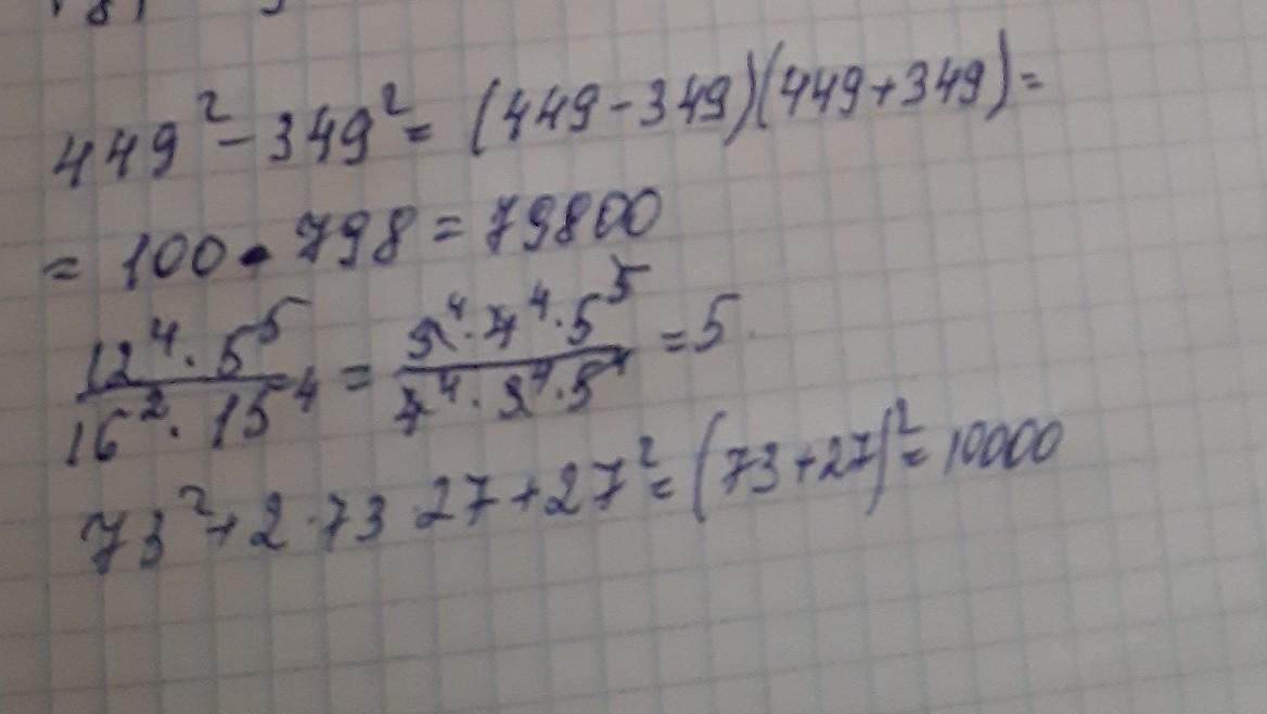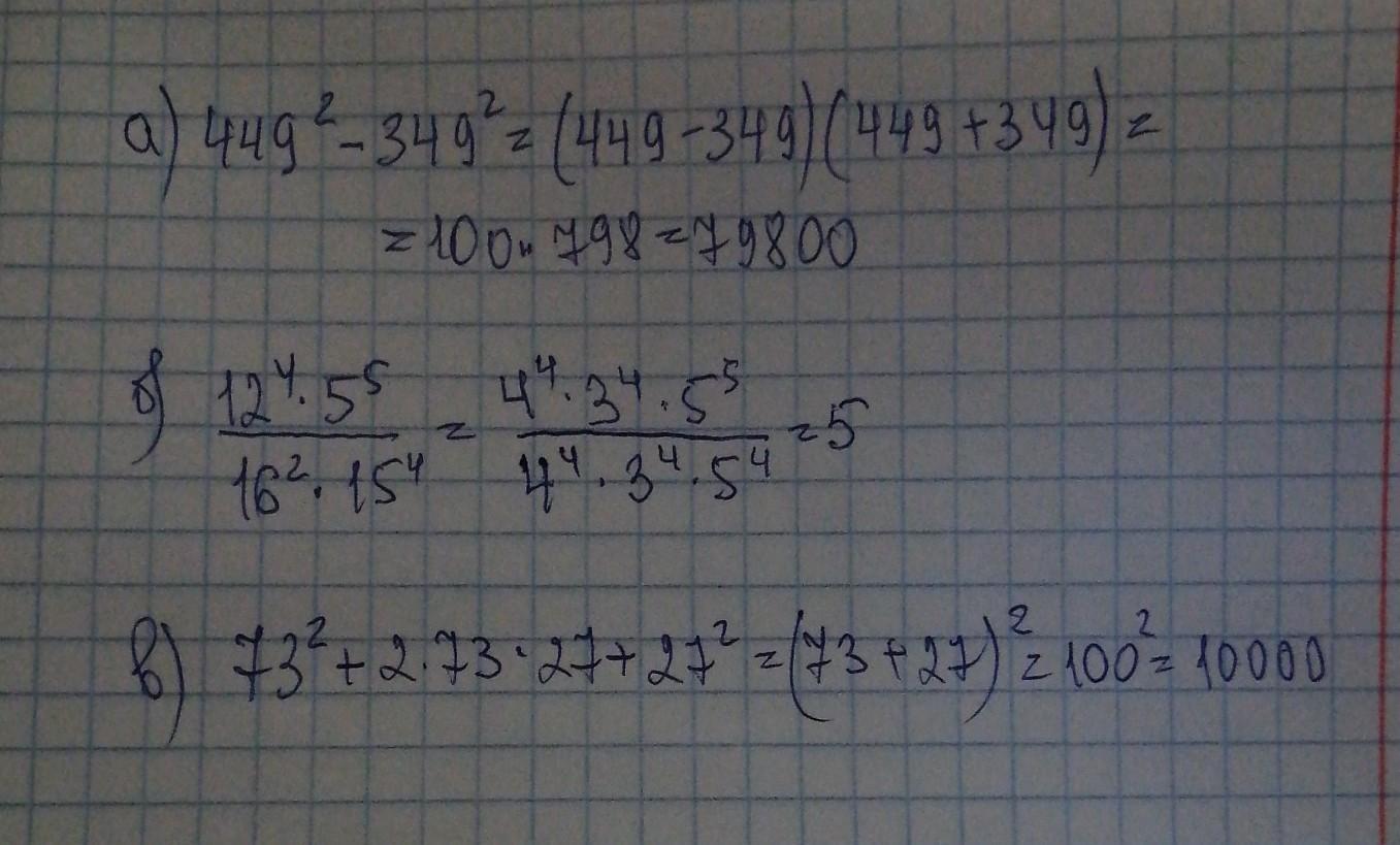 Найдите значение выражения наиболее рациональные способом a) 449^2-349^2 б) на фотке в) 73^2+2×3×27×27^2