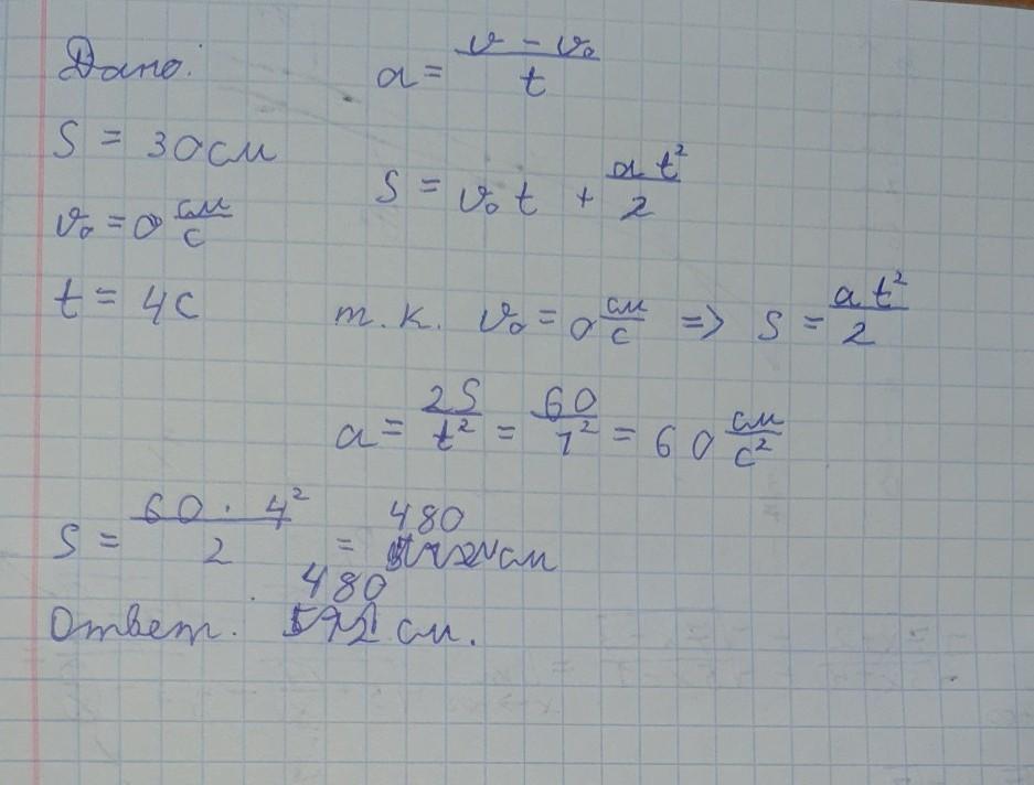 Шар, двигаясь из состояния покоя равноускоренно, за первую секунду прошел путь 30 см. Какой путь (в см) он пройдет за 4 секунды от начала движения?