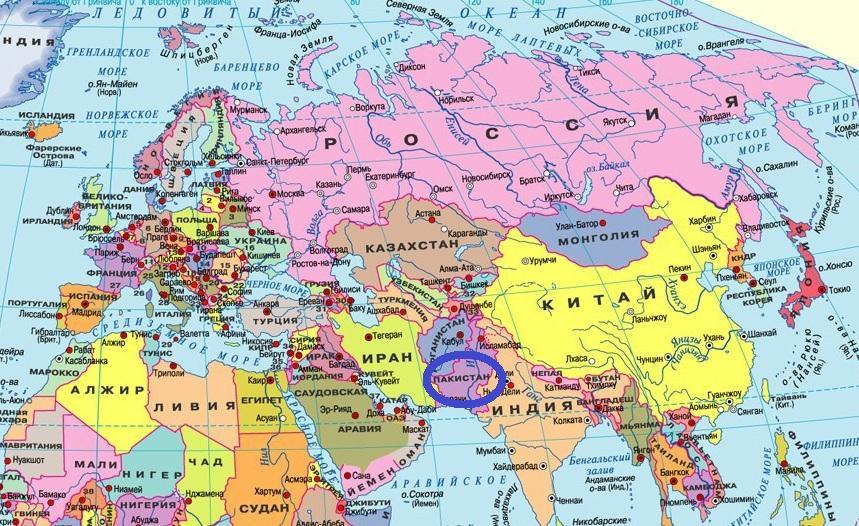 На каком материке и в какой части света находится Пакистан? Если мы посмотрим на карту, которая дана ниже, то увидим, что Пакистан расположен на материке Евразия в части света Южная Азия.
