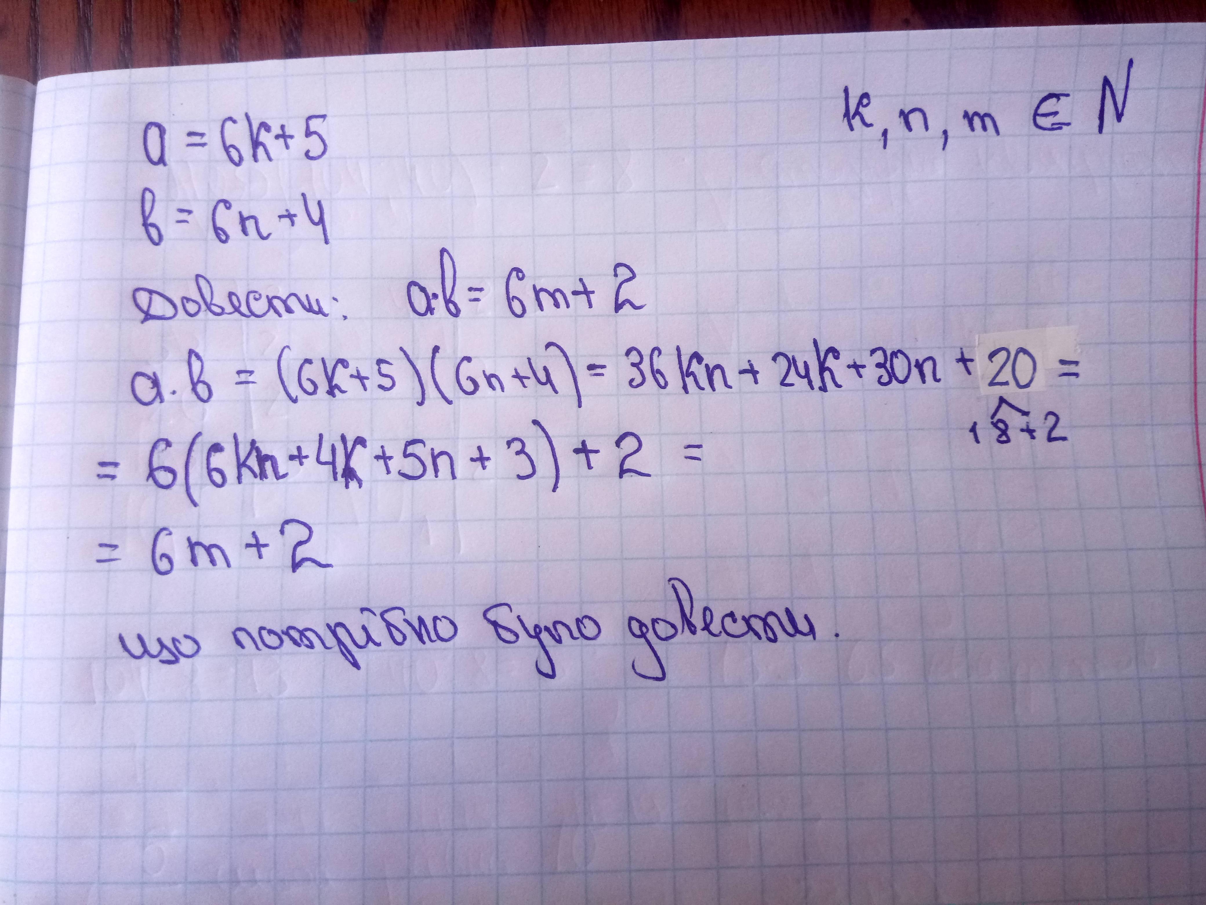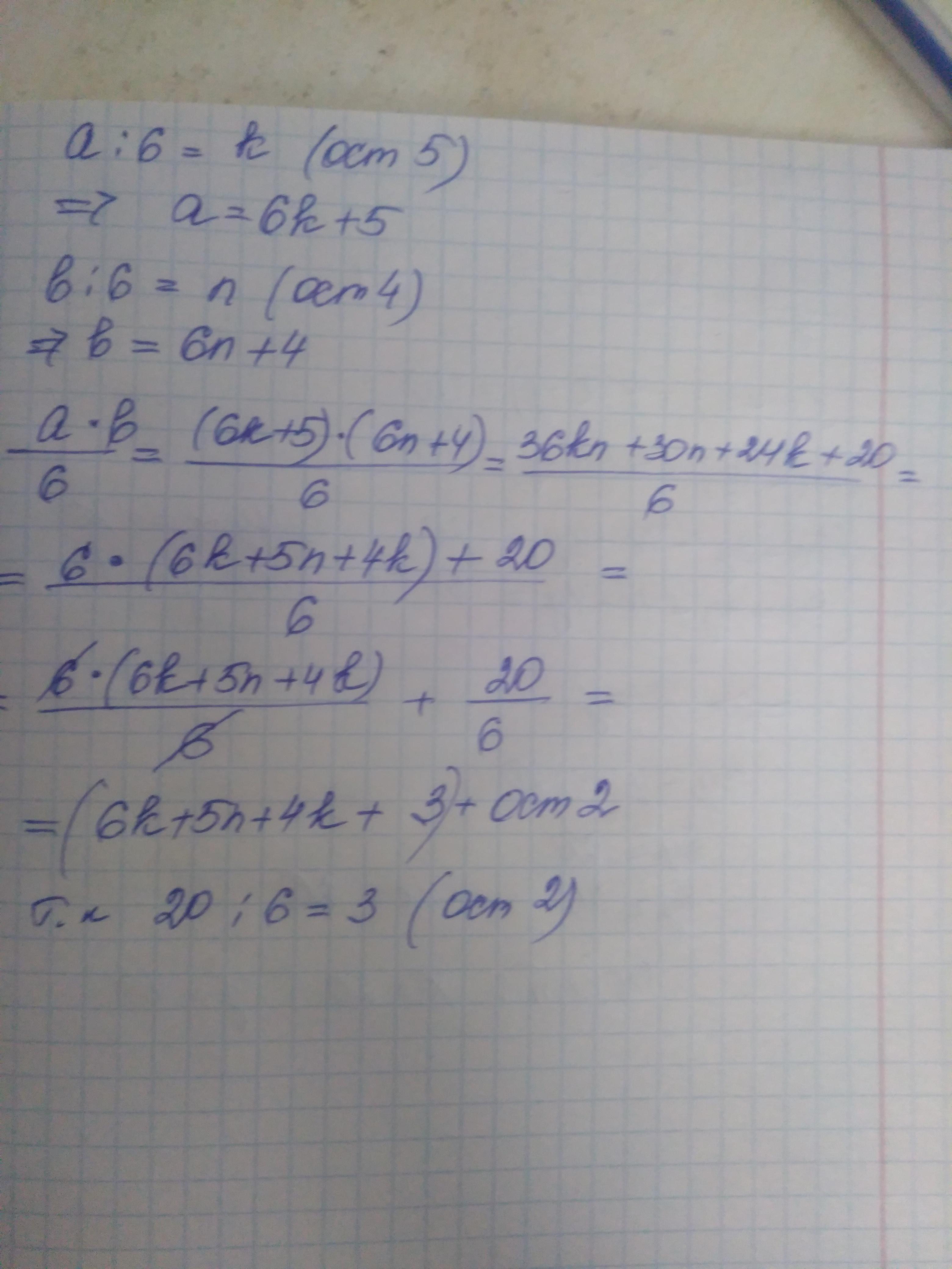 5. Остача при діленні натурального числа а на 6 дорівнює 5, а остача при діленні натурального числа b на 6 дорівнює 4. Доведіть, що остача при діленні добутку чисел а і б на 6 дорівнює 2.